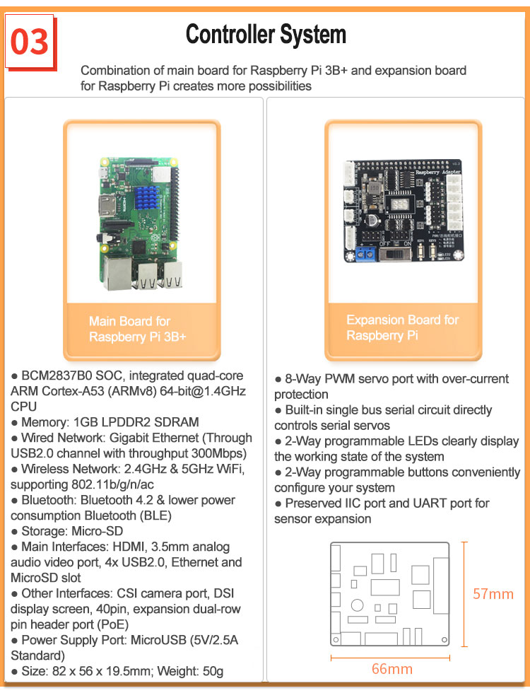 - Hardware of Controller System: Main Board for Raspberry Pi 3B+ & Expansion Board for Raspberry Pi