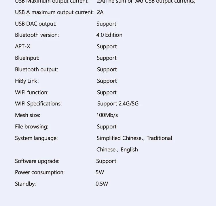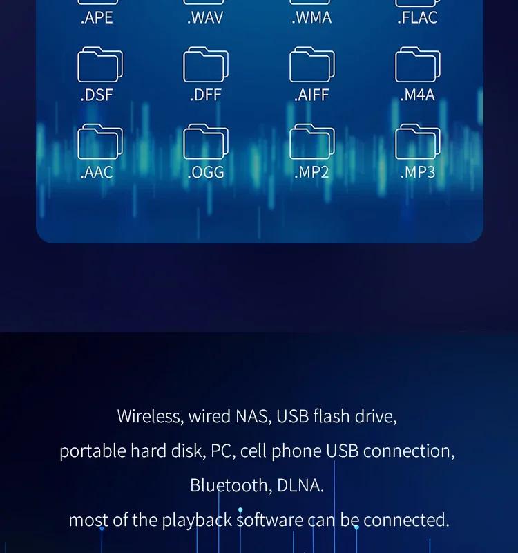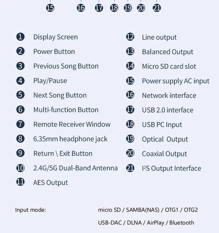 - Input mode: Micro SD, SAMBA (NAS), OTG1, OTG2, USB-DAC, DLNA, AirPlay, Bluetooth, RCA, XLR, Headphone