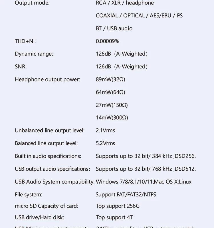 - USB output audio specification: supports up to 32bit/768kHz, DSD512