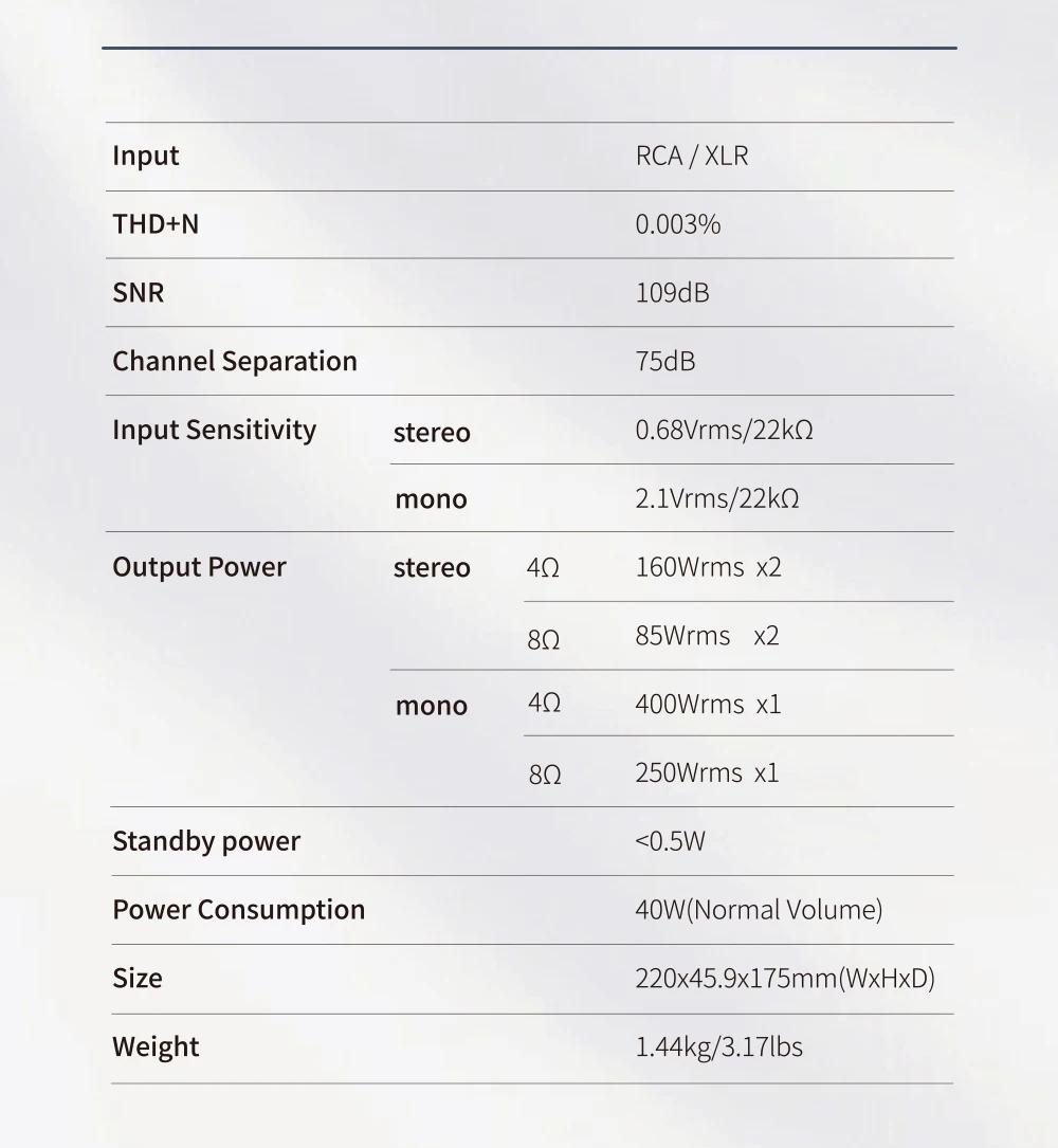 Stereo mode: 160Wrms x 2 at 4ohms; 85Wrms x 2 at 8ohms
