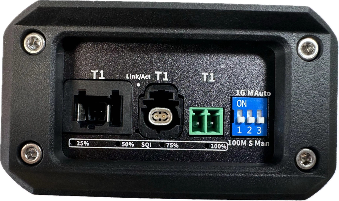 SE1001 Pro is in automatic mode, and the device will automatically link to regular automotive Ethernet and Legacy Ethernet. When set to automatic mode, the first two DIP switches are invalid. When set to Man (manual) mode, the first two DIP switches are valid. When it is in automatic mode, connect T1 signal first, and then connect RJ45 signal.