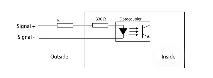 When external signal amplitude is 3.3-5V, the current limiting resistor R may not be connected. When signal amplitude exceeds 5V, input signal must be current limited to ensure that the input current of optocoupler is 8mA-15mA. Specific calculation method: On-voltage drop of optocoupler is generally about 1.1-1.3V, we get 1.2V, so the optocoupler's current = (voltage amplitude-optocoupler on-voltage drop 1.2V) / (R + 330)