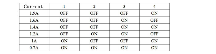 It lists common combinations of current-level DIP switches, and the other combinations can achieve other phase current settings. Specifically, it can be calculated by measuring voltage at the test point Vref.