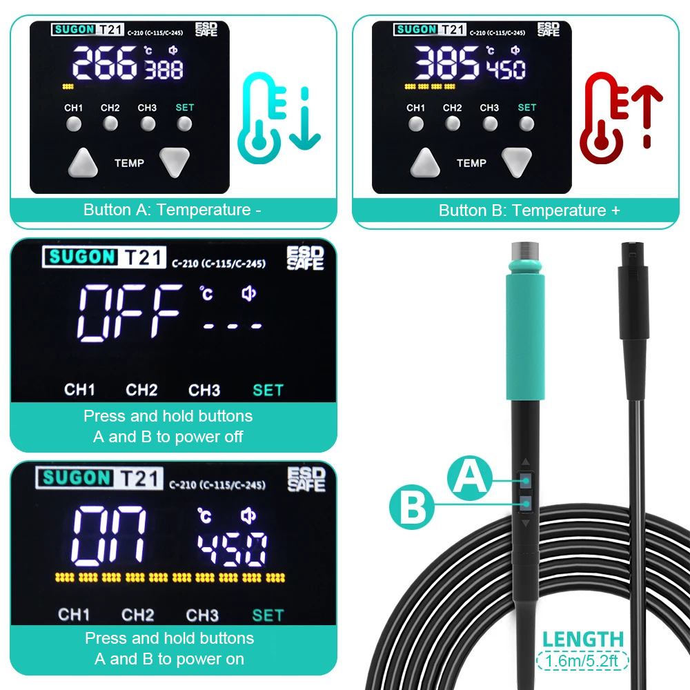SUGON T21 soldering station uses a program chip to control the temperature, with the latest patented technology. The handle can control and adjust the temperature. Quickly and accurately heat for 2 seconds to melt tin. It is one of the equipment selected by maintenance beginners and professional-level personnel.