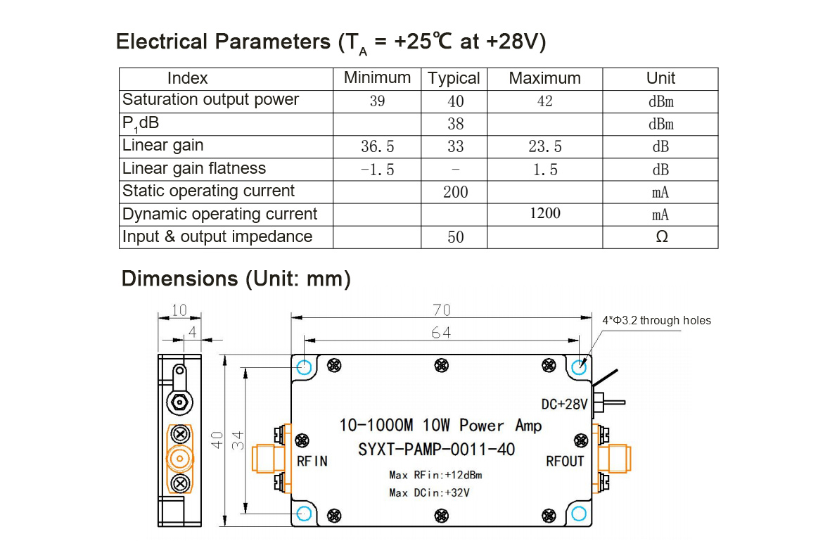 The 10-1000MHz 10W wideband RF power amplifier uses MOSFET as its final amplifier. It achieves a small-signal linear gain of 33dB over a wideband range. Saturation output power can reach 10W typically.
