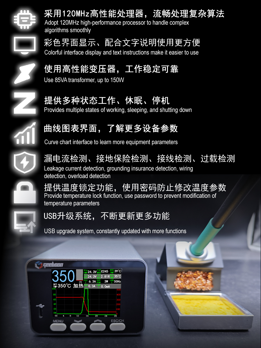 - Built in ring transformer, with a main unit weight of approximately 1.9Kg, equipped with AC pulse heating, leakage detection, and grounding safety status detection.