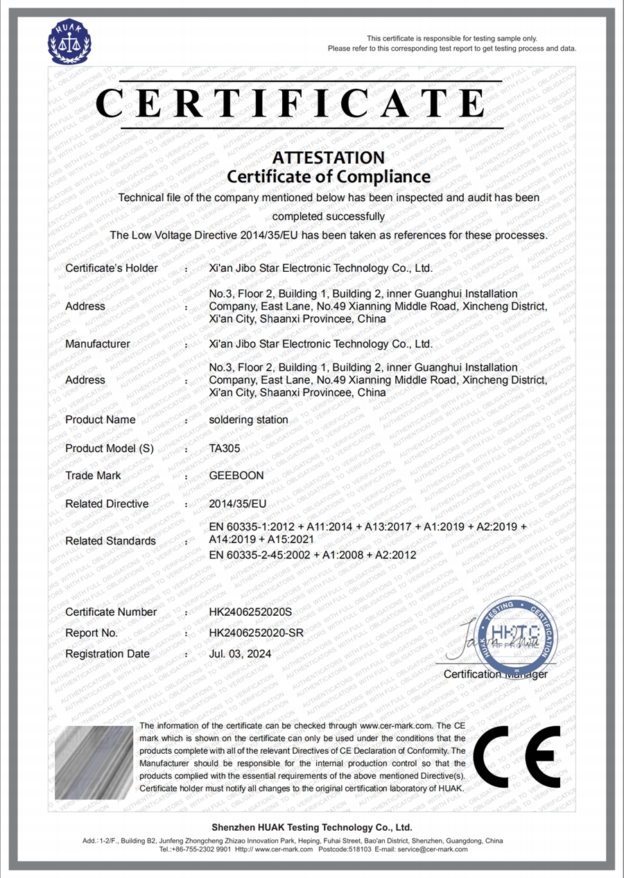 - The voltage of the soldering iron tip to ground is less than 2mv (RMS), the resistance is less than 2Ω, and it meets the safety standard of ANSI/ESD S20.20-2014. It can repair precision instruments, and this parameter is most important for precision products. (Measurement method: Use a multimeter to measure the voltage between the rear grounding wire and the soldering iron tip in AC mode, please not that the full power heating of the soldering iron tip when draining water)