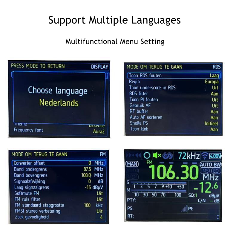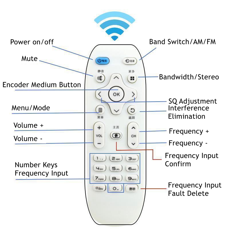 - Added infrared remote control, numeric keypad input frequency, volume level, channel adjustment, and SQ value settings. Other functions can be operated with the remote control.