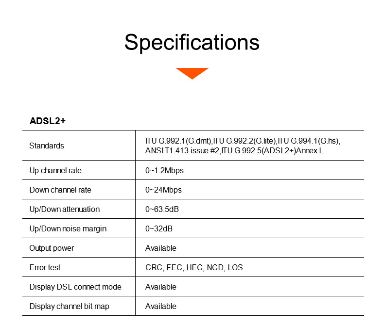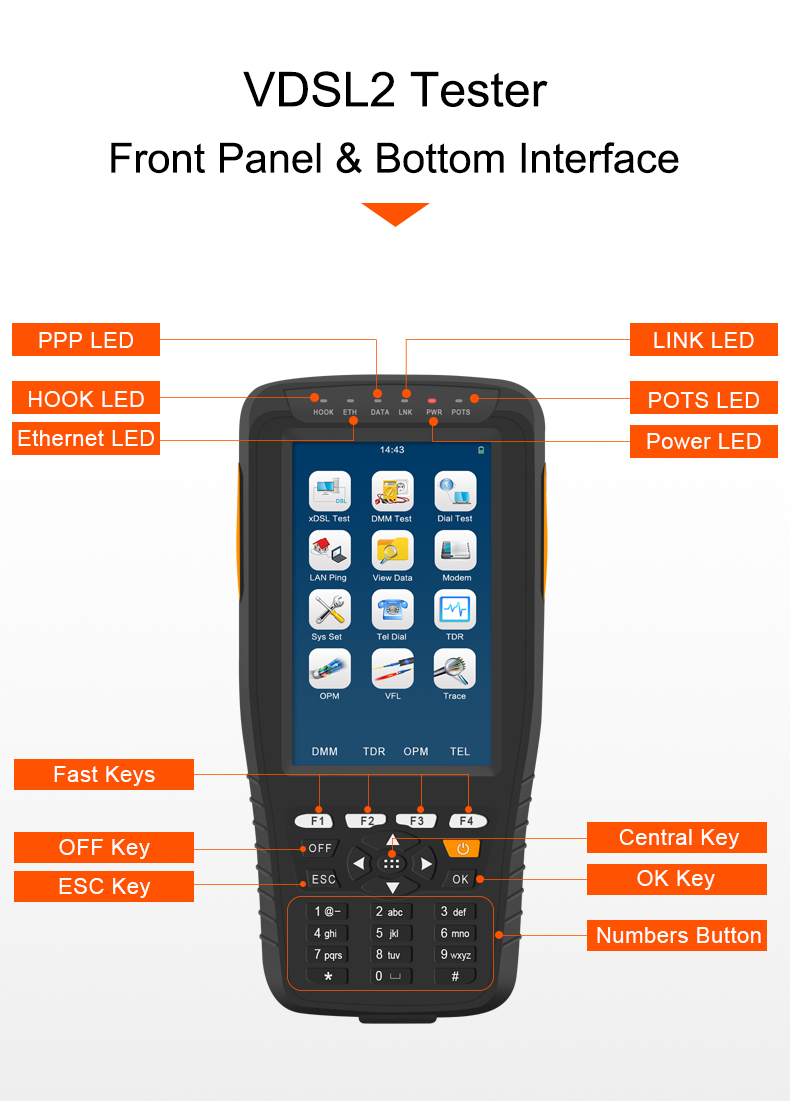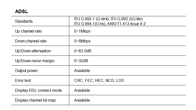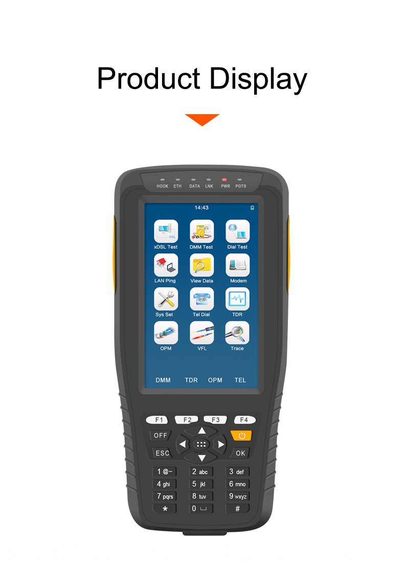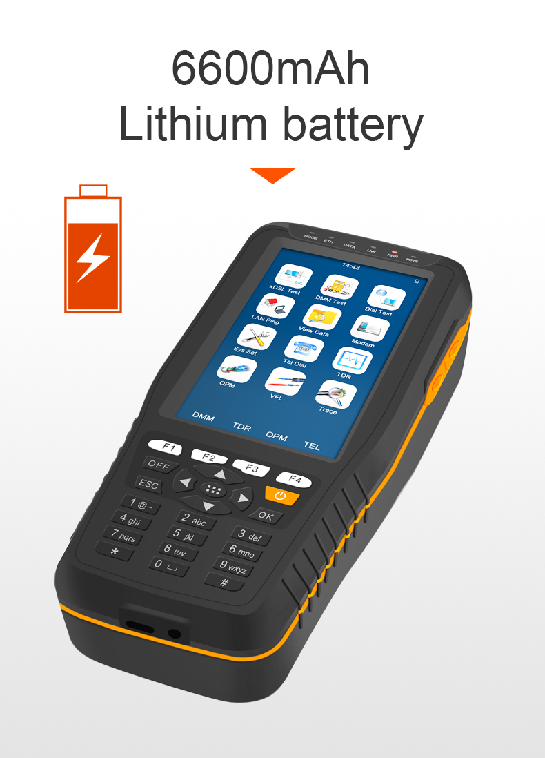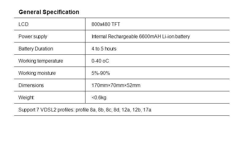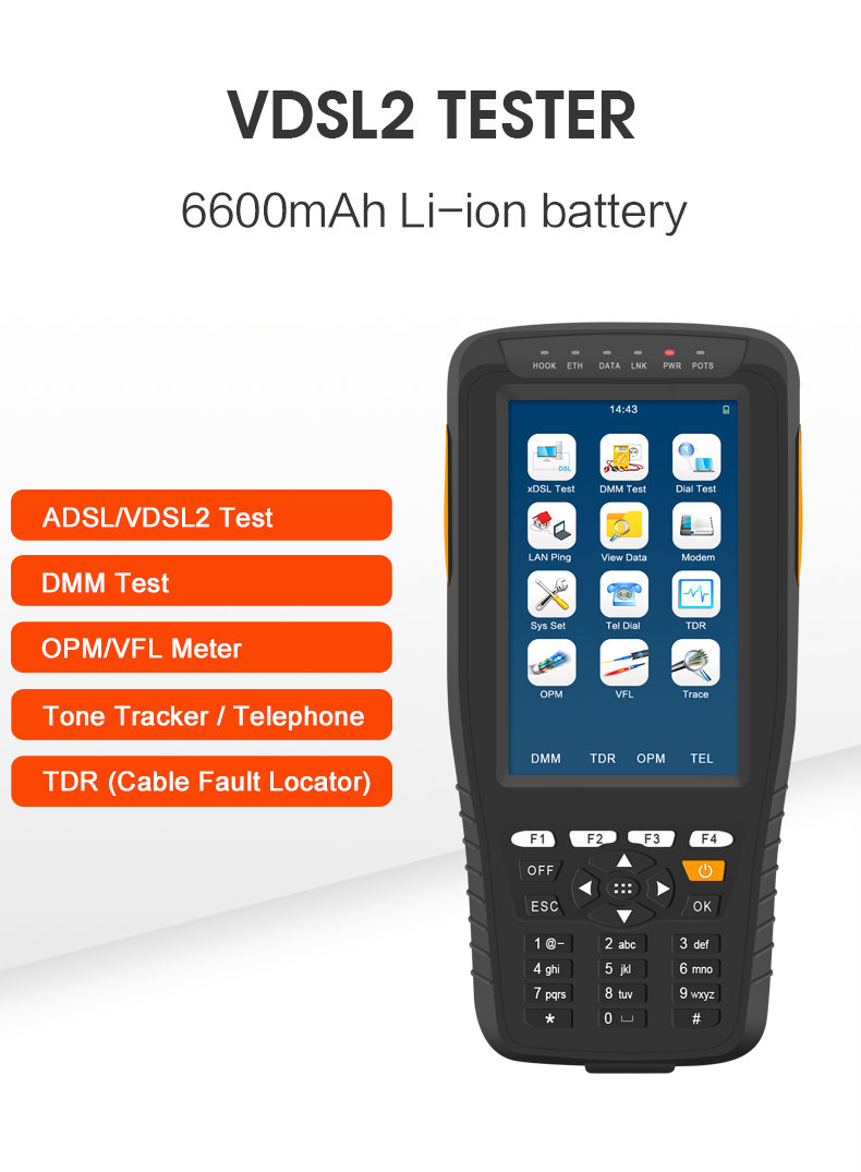 TM-600 VDSL tester specially designed for xDSL line test (xDSL include: ADSL, ADSL2, ADSL2+, READSL, VDSL2 etc.) and maintenance It provides xDSL test, PPPoE dial test, DMM test, Modem emulation, line voltage indication and so on.