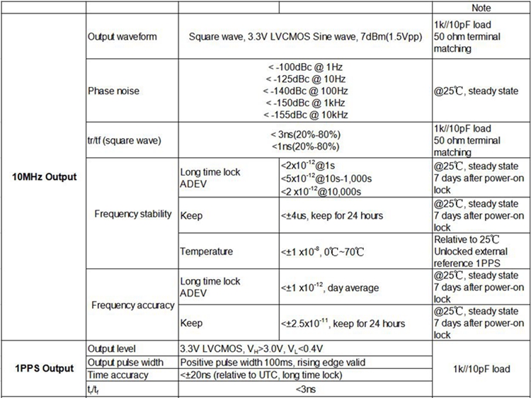 - Output: 2 channels 10MHz square wave (3.3V), 2 channels 10MHz sine wave (1.5Vpp), 1 channel 1PPS (3.3V)