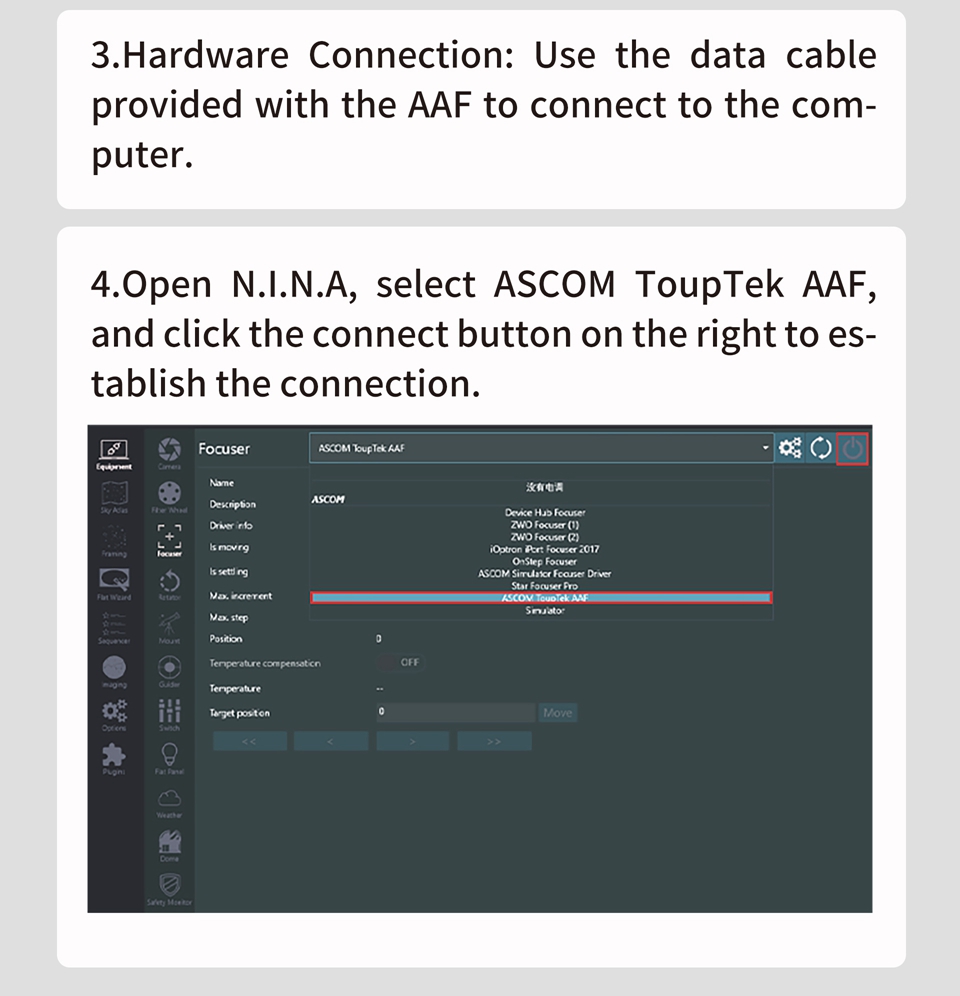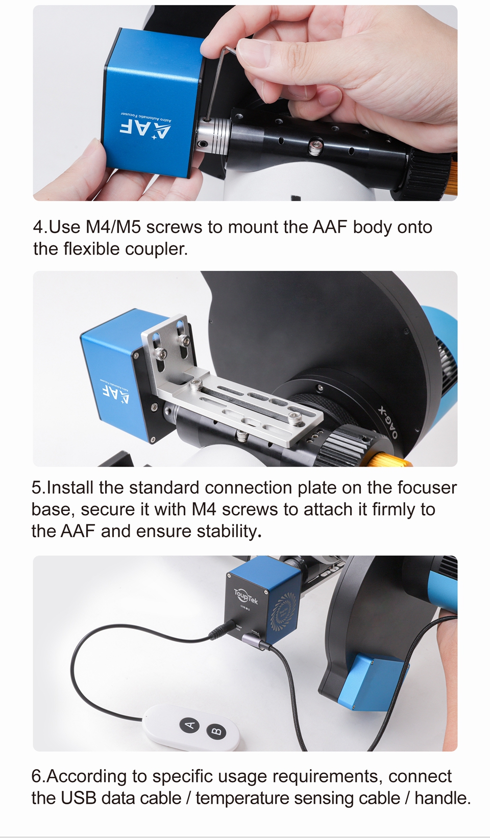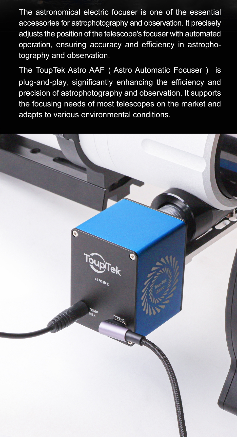 - The ToupTek Astro AAF (Astro Automatic Focuser) is plug-and-play, significantly enhancing the efficiency and precision of astrophotography and observation. It supports the focusing needs of most telescopes on the market and adapts to various environmental conditions.