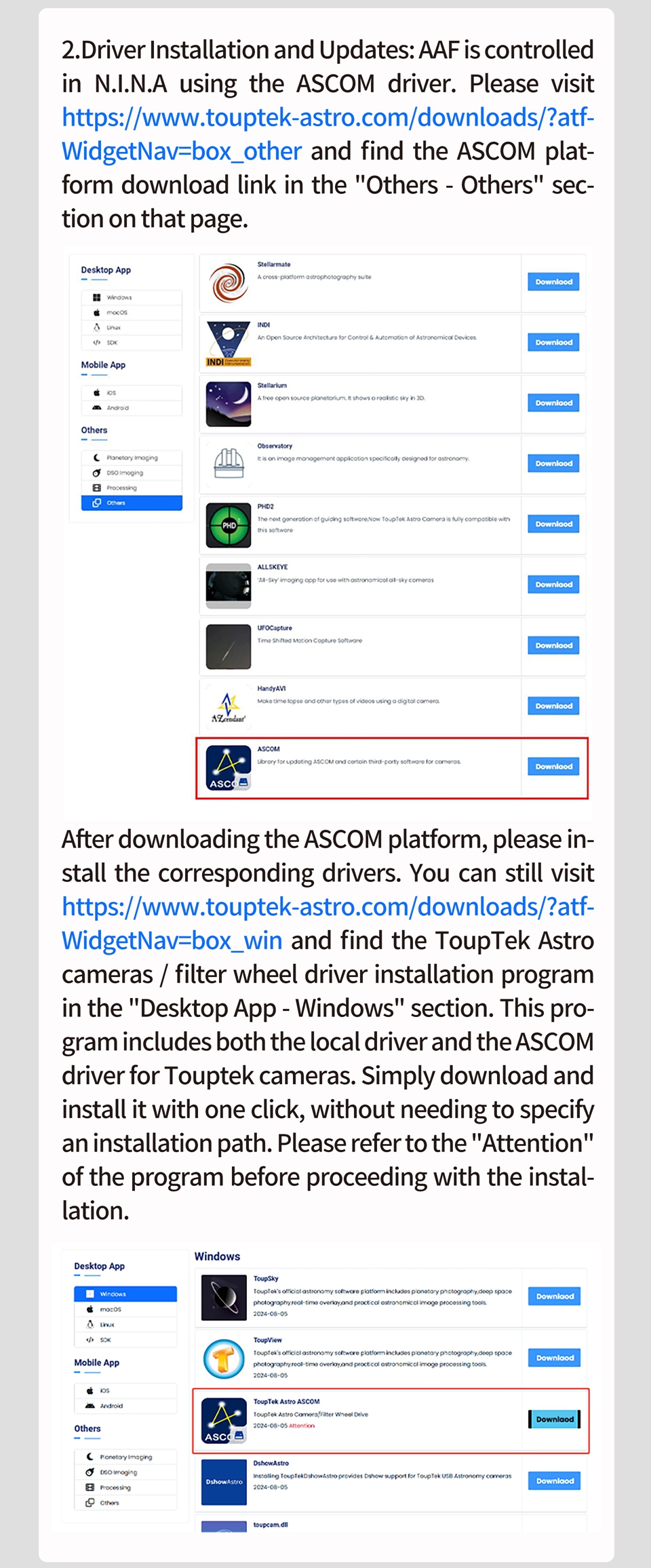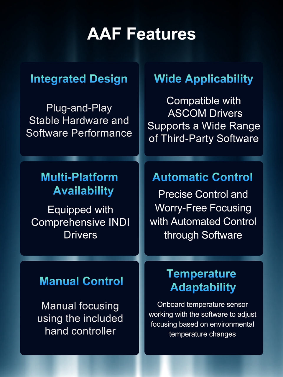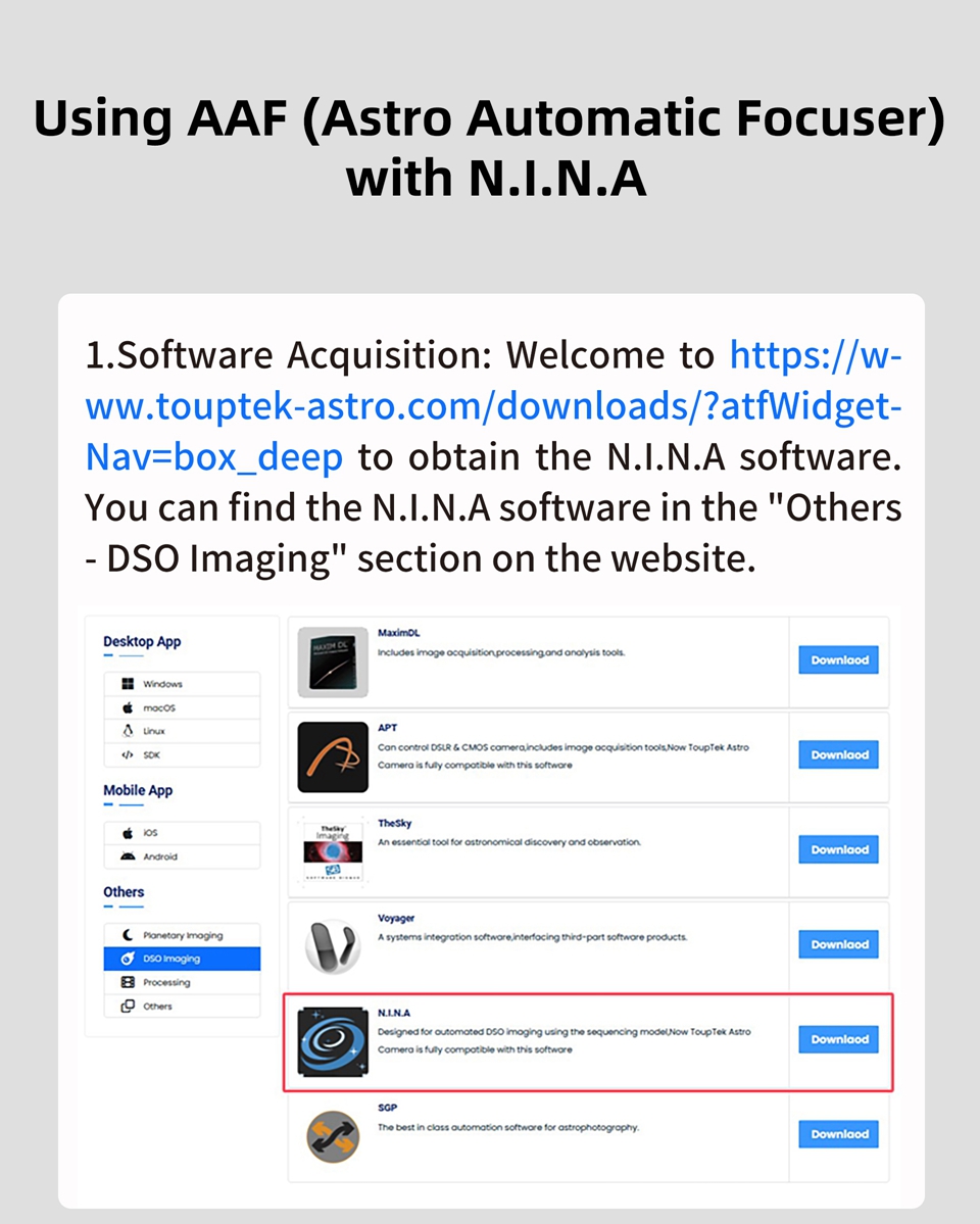 - The ToupTek Astro AAF (Astro Automatic Focuser) is plug-and-play, significantly enhancing the efficiency and precision of astrophotography and observation. It supports the focusing needs of most telescopes on the market and adapts to various environmental conditions.