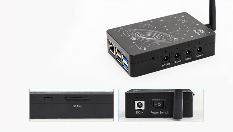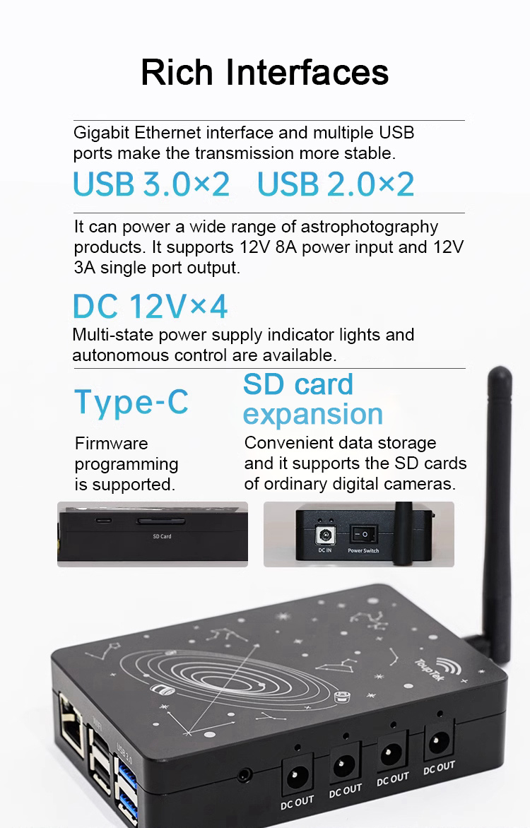 - Rich interfaces: There are many ports, including USB3.0x2, USB 2.0x2, DC12V x 4, Type-C and SD card slot. Gigabit Ethernet interface and multiple USB ports make the transmission more stable. It can power a wide range of astrophotography products. It supports 12V 8A power input and 12V 3A single port output. Multi-state power indicator light and autonomous control are available. Firmware programming is supported. Convenient data storage and it supports the SD cards of ordinary digital cameras.