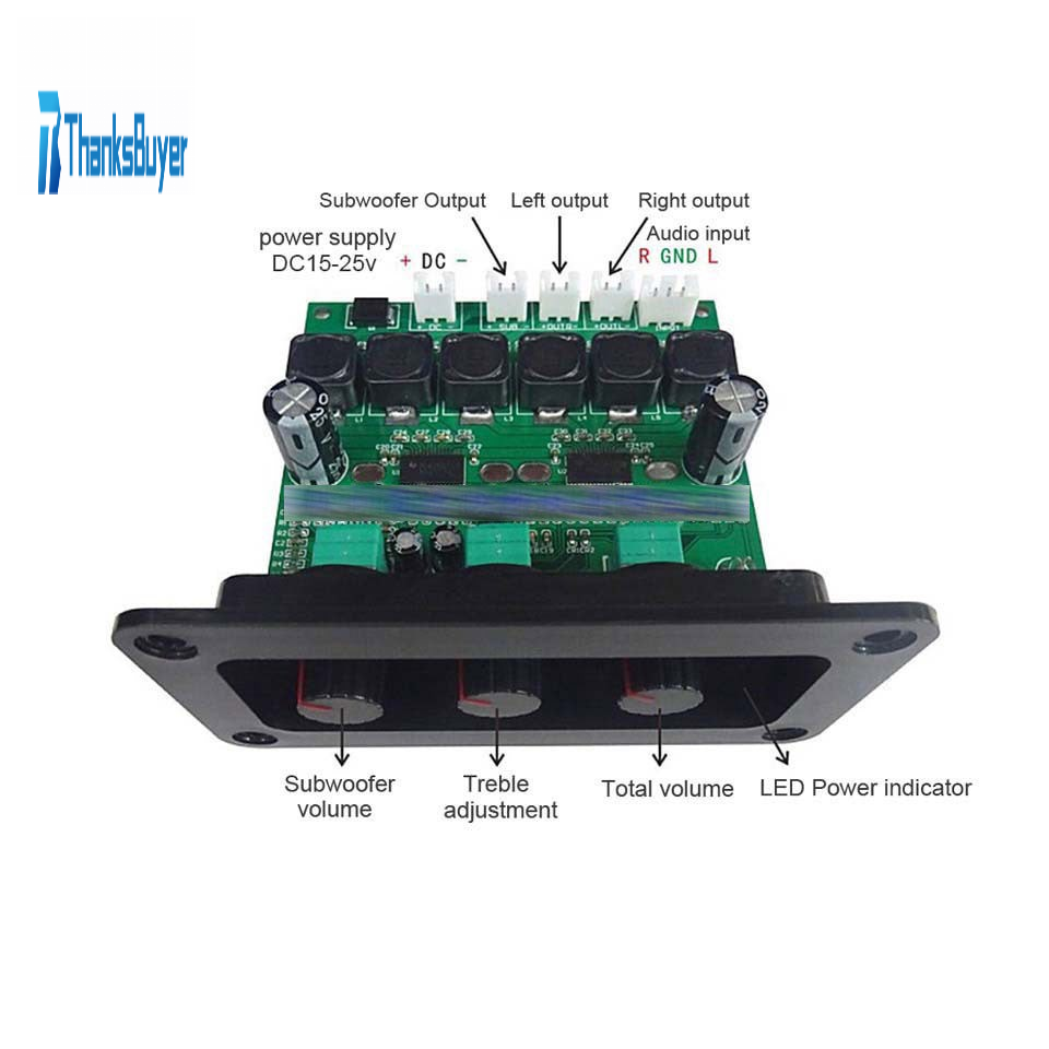 -The power supply requirement is 15-25V 4A; the board can work normally under 2*30w 8 ohm + 60w 4 ohm power.