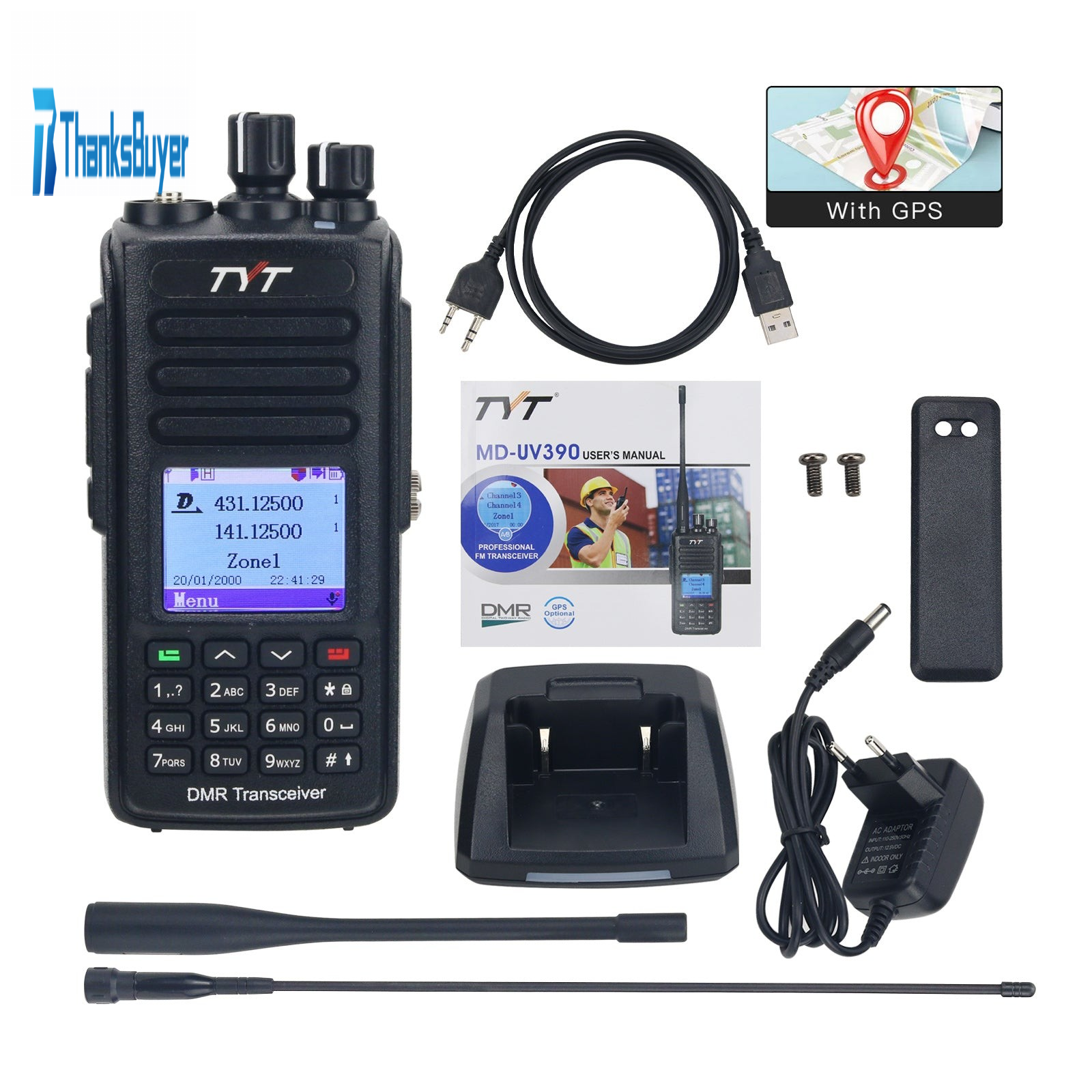 TYT MD-UV390 5W DMR Transceiver VHF UHF IP67 Waterproof Walkie Talkie with Programming Cable GPS