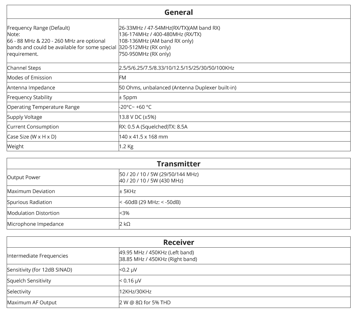 ★★ Frequency: TX 26-33(10M)/47-54(6M)/136-174(2M)/400-480MHz(70CM), RX: 26-33/47-54/108-180/320-512/750-950MHz (P.S. AM mode selectable on VHF receive frequencies for Air Band reception), Output Power VHF: 50/20/10/5W UHF: 35/20/10/5W.