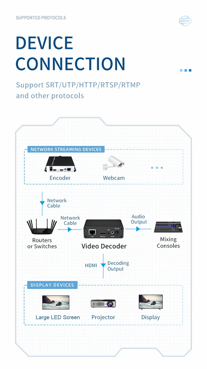 * Protocol: SRT/UTP/HTTP/RTSP/RTMP/HLS/FLV/UDP Multicast Unicast