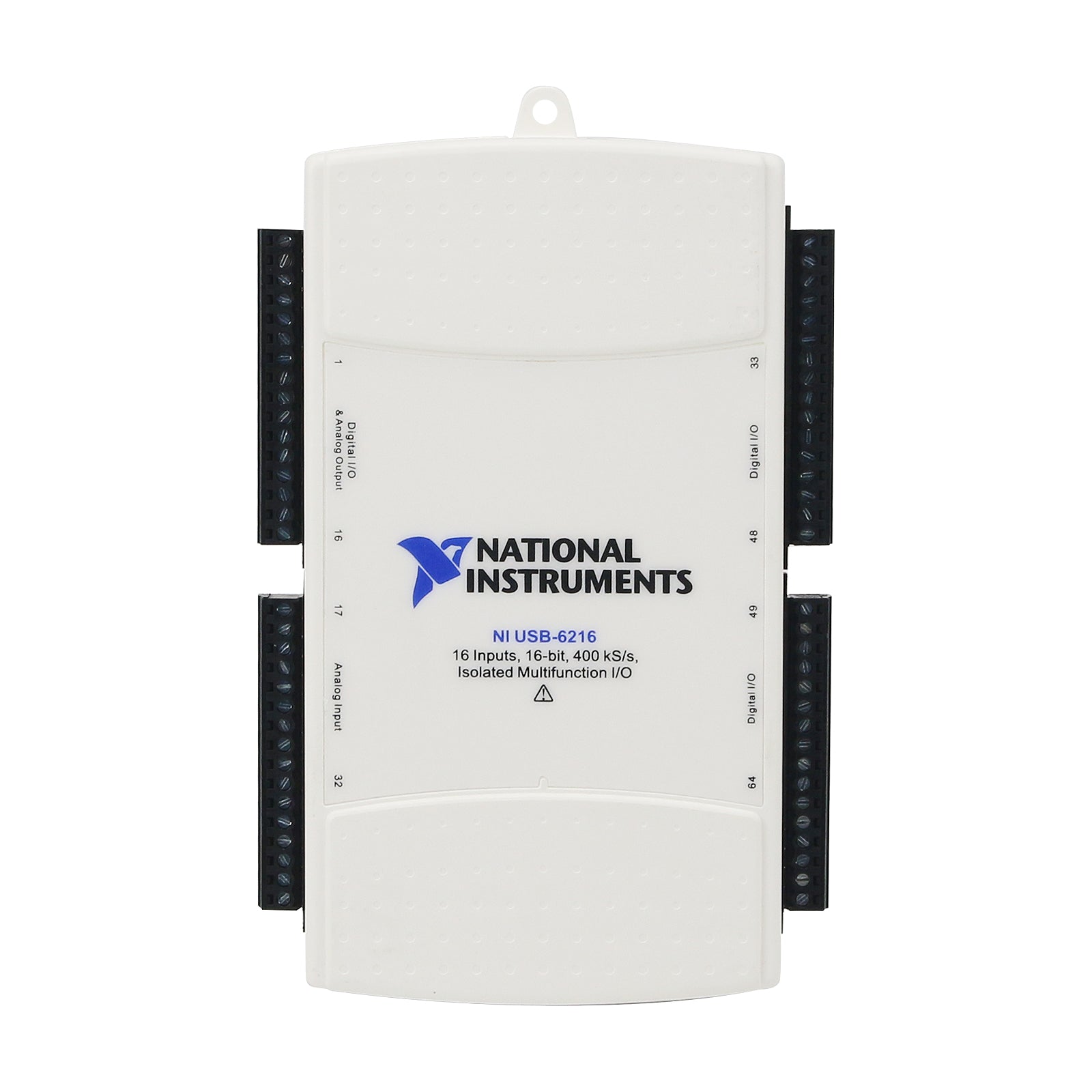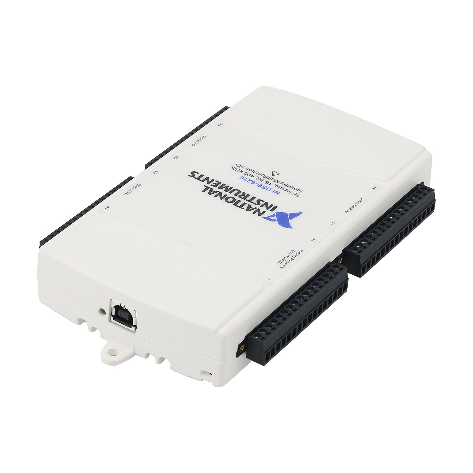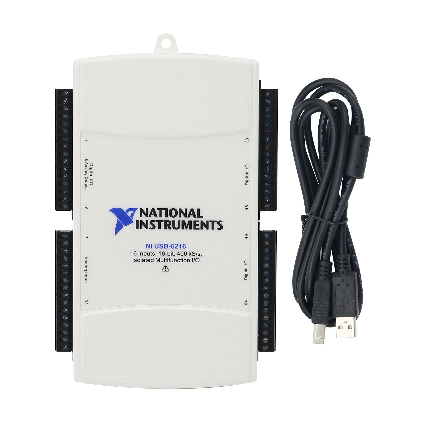 Isolated 16 AI (16-Bit, 400kS/s), 2 AO (250kS/s), up to 32 DIO USB Multifunction I/O Device—The USB-6216 is an isolated, multifunction DAQ device. It offers analog I/O, digital I/O, and two 32-bit counters. For improved accuracy and safety, the USB-6216 provides 60 V, CAT I isolation. It also features signal streaming technology that gives you DMA-like bidirectional high-speed streaming of data across USB. The device is ideal for test, control, and design applications including portable data logging, field monitoring, embedded OEM, in-vehicle data acquisition, and academic.