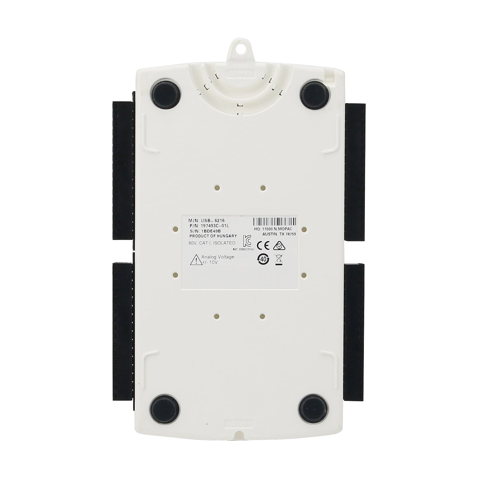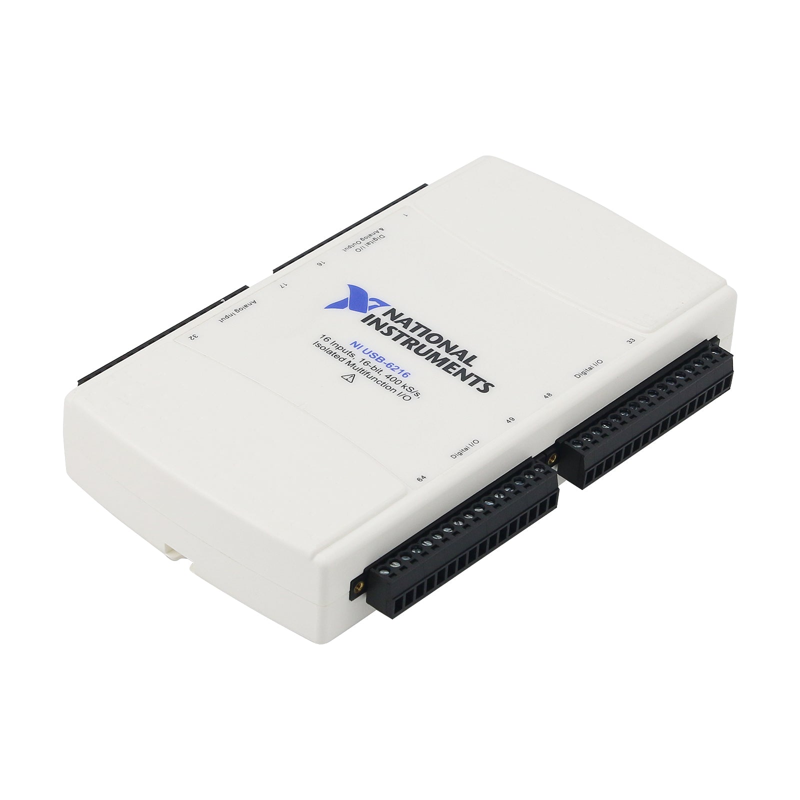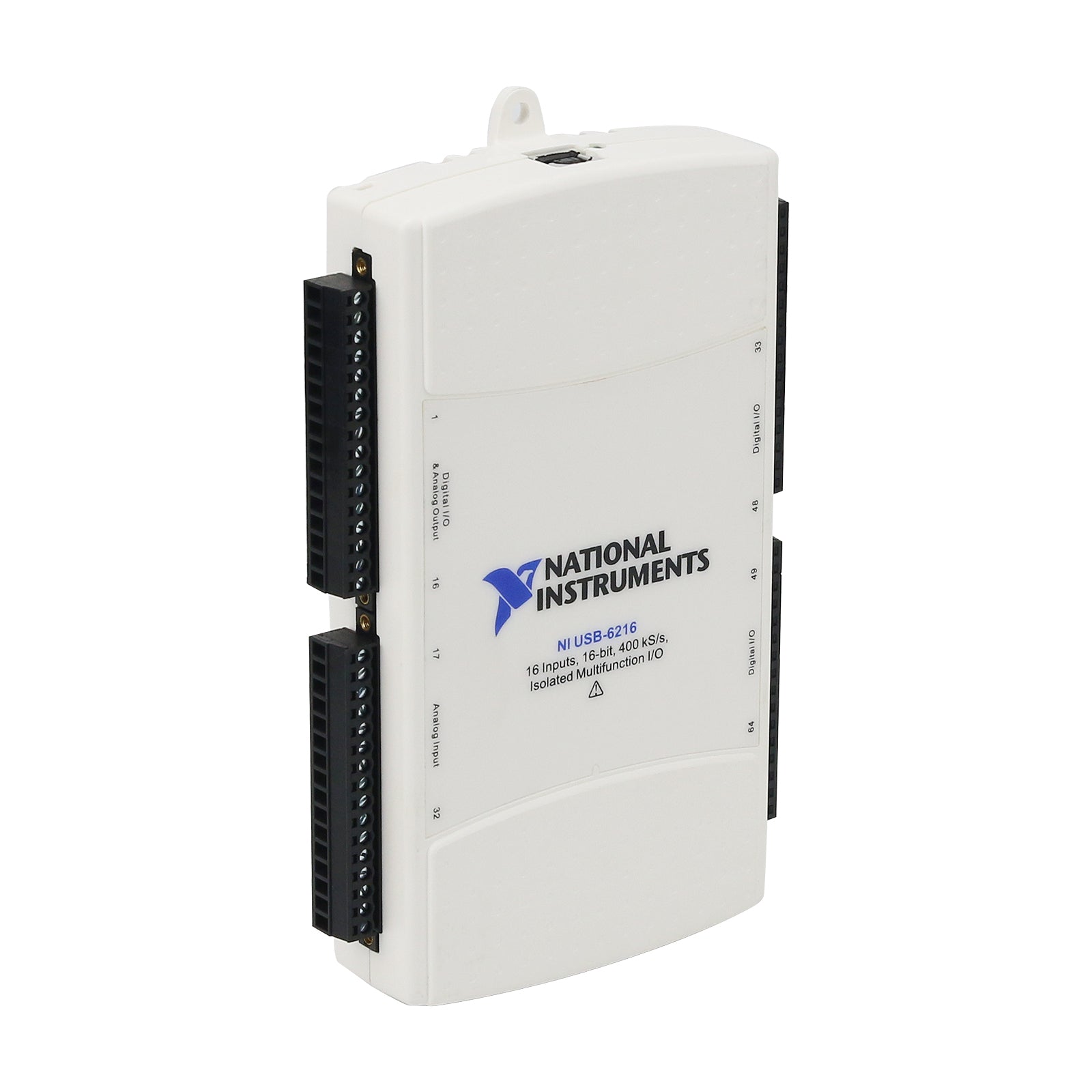 Isolated 16 AI (16-Bit, 400kS/s), 2 AO (250kS/s), up to 32 DIO USB Multifunction I/O Device—The USB-6216 is an isolated, multifunction DAQ device. It offers analog I/O, digital I/O, and two 32-bit counters. For improved accuracy and safety, the USB-6216 provides 60 V, CAT I isolation. It also features signal streaming technology that gives you DMA-like bidirectional high-speed streaming of data across USB. The device is ideal for test, control, and design applications including portable data logging, field monitoring, embedded OEM, in-vehicle data acquisition, and academic.