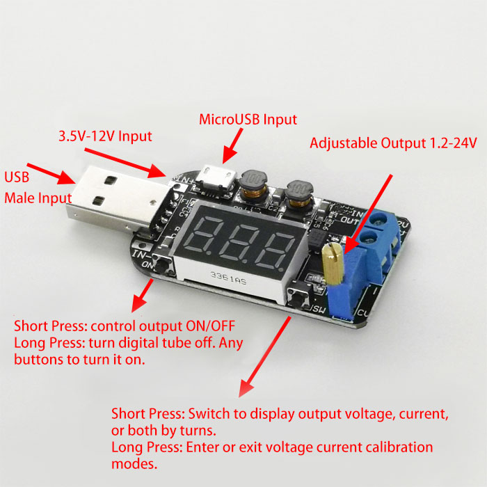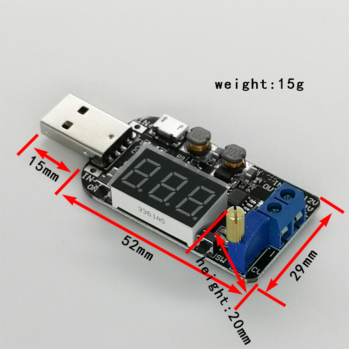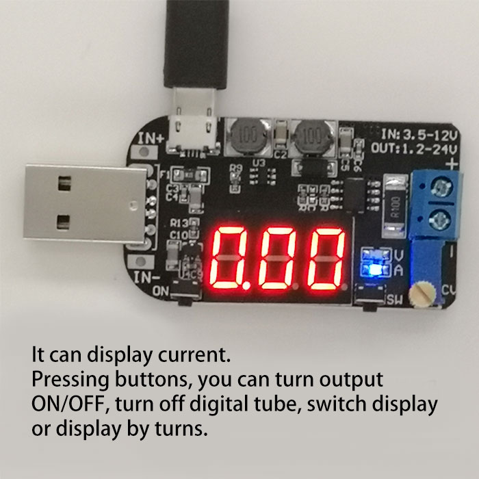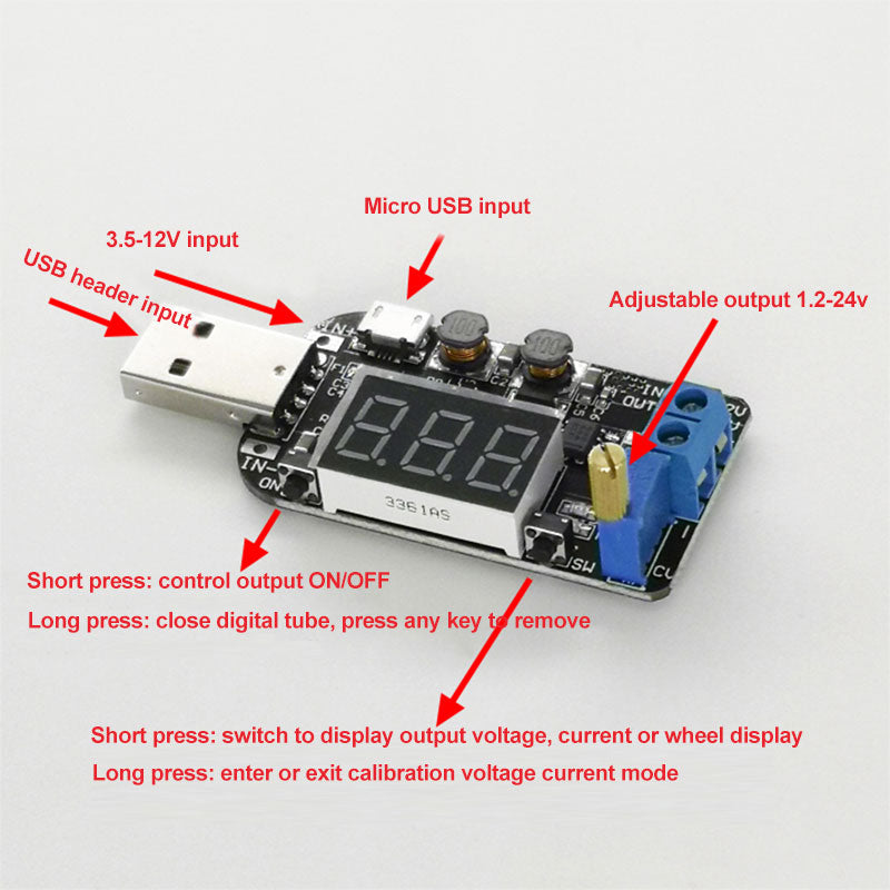 As long as you have a mobile phone charger and a USB 5V adapter, you can output an adjustable voltage from 1.2V to 24V with a power of 3W. You can use USB male or microUSB as input, it is very convenient to use. The voltage regulator uses a precise and long potentiometer, which can be adjusted manually without using a screwdriver. With voltage and current.