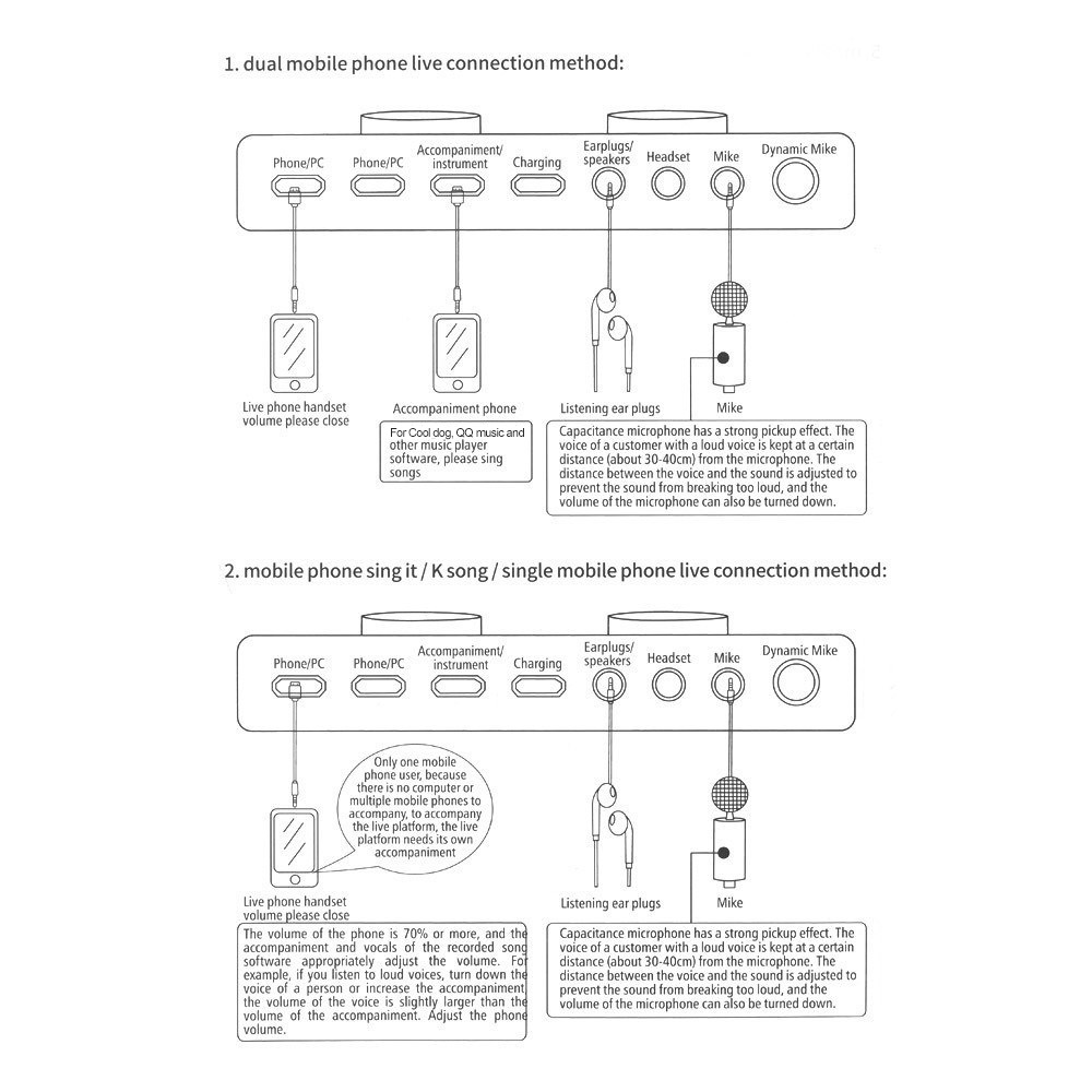 - With USB jack for LIVE1, LIVE2 and accompaniment instruments; 3.5 mm headphone speaker and headphone output jack; 3.5 mm condenser microphone and 6.35 mm dynamic microphone input jack.