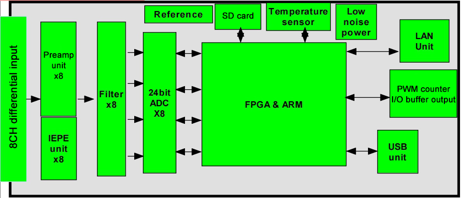 * In IEPE mode, the output is 24V 4mA (compatible with 2mA), and the ADC input is in an AC coupled input state. Eight channels can be independently switched and controlled. Differential input connection can further reduce transmission interference.