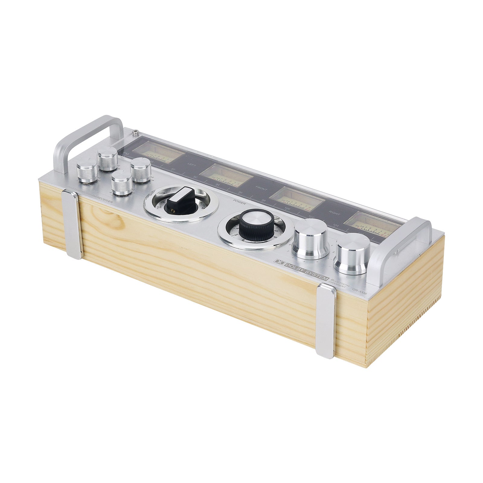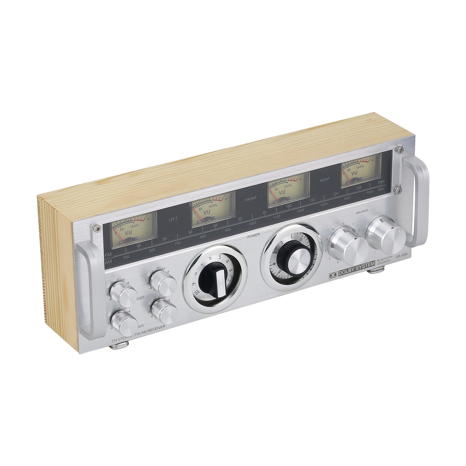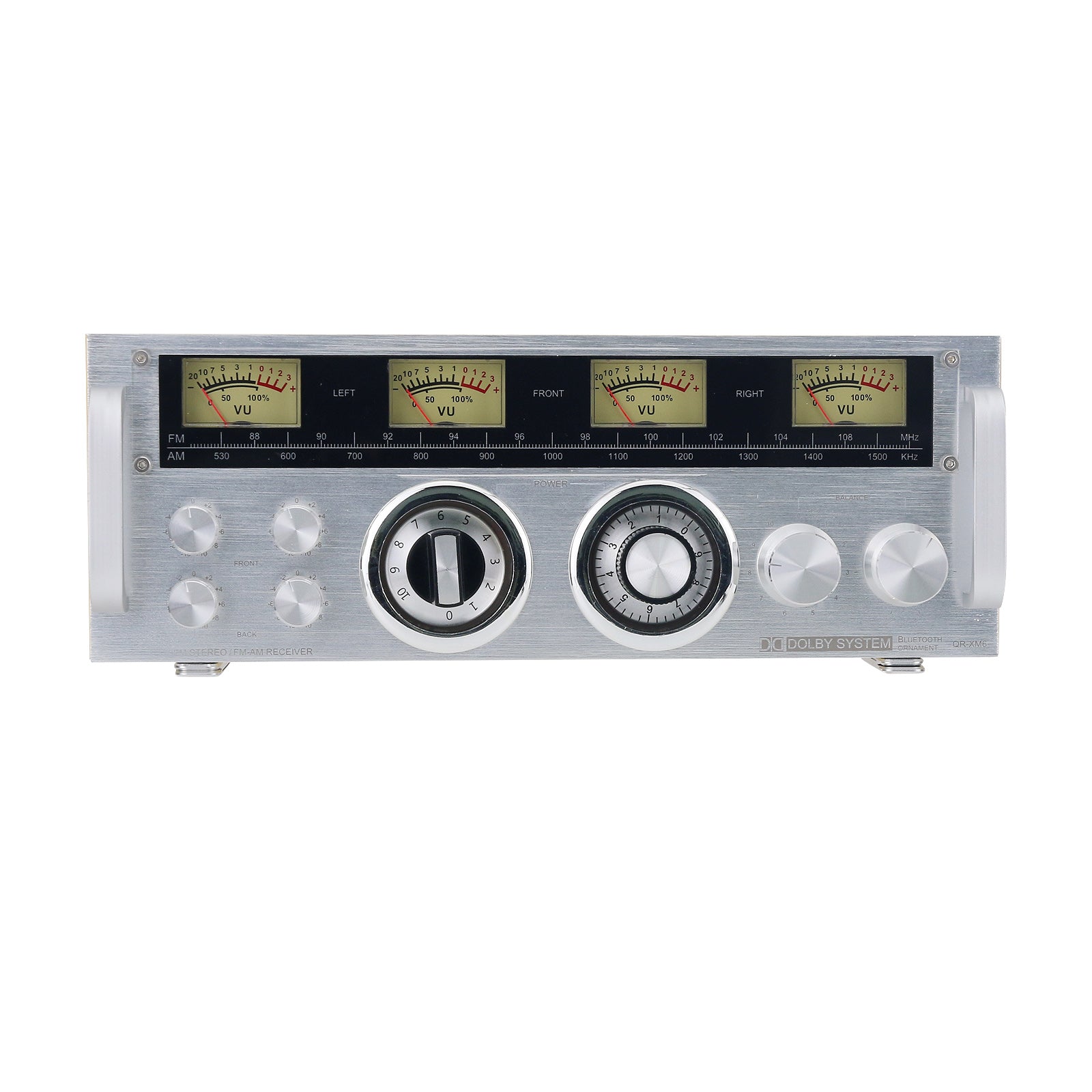 - The four small metal knobs on the left are for decoration. The two large metal knobs on the right are also decorative. There are two middle large knobs (one is the power switch, and the other is the VU meter sensitivity knob).