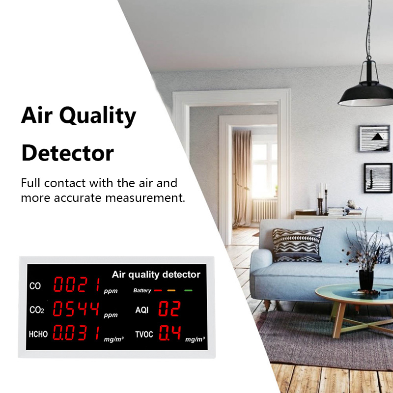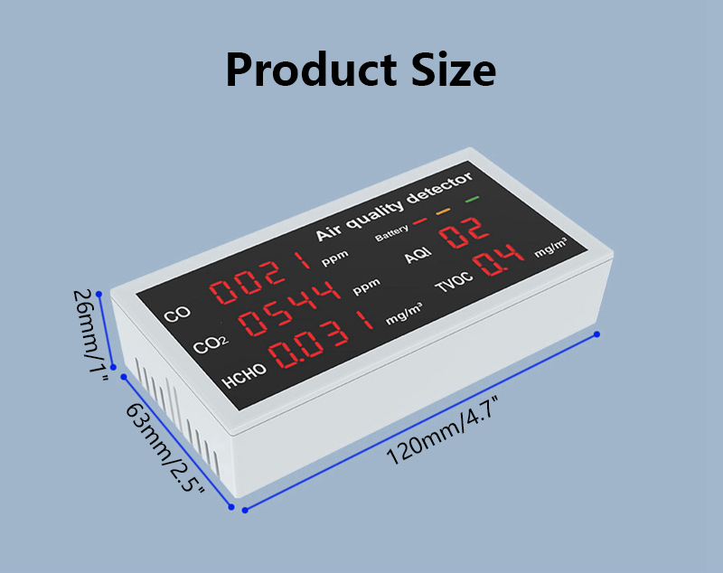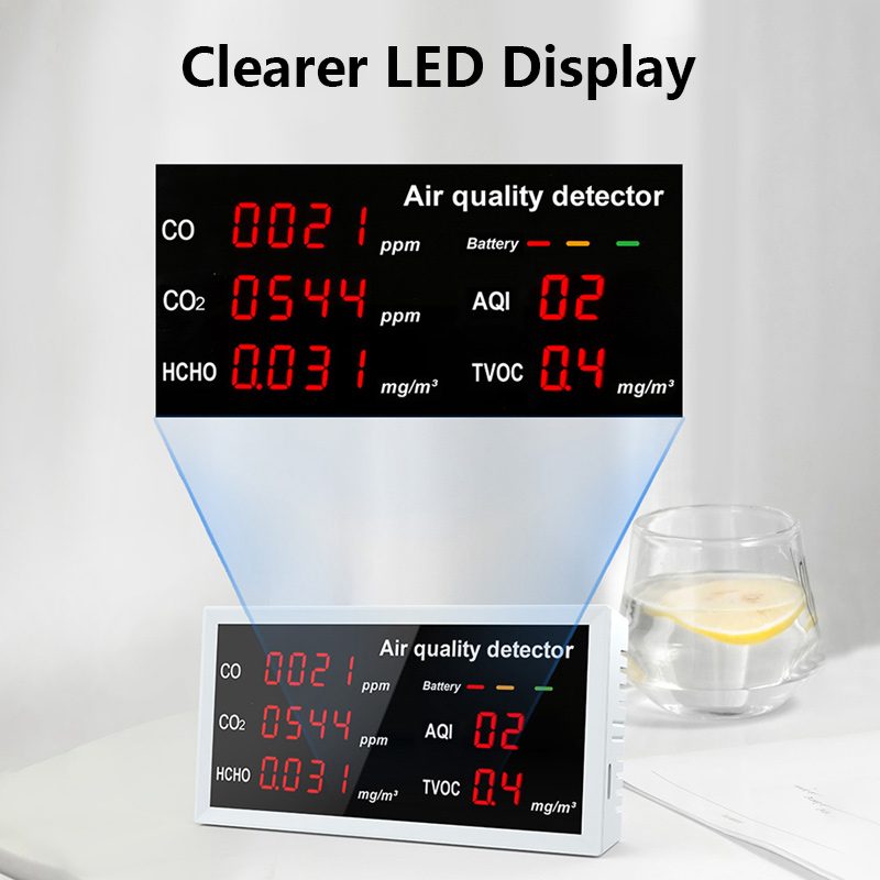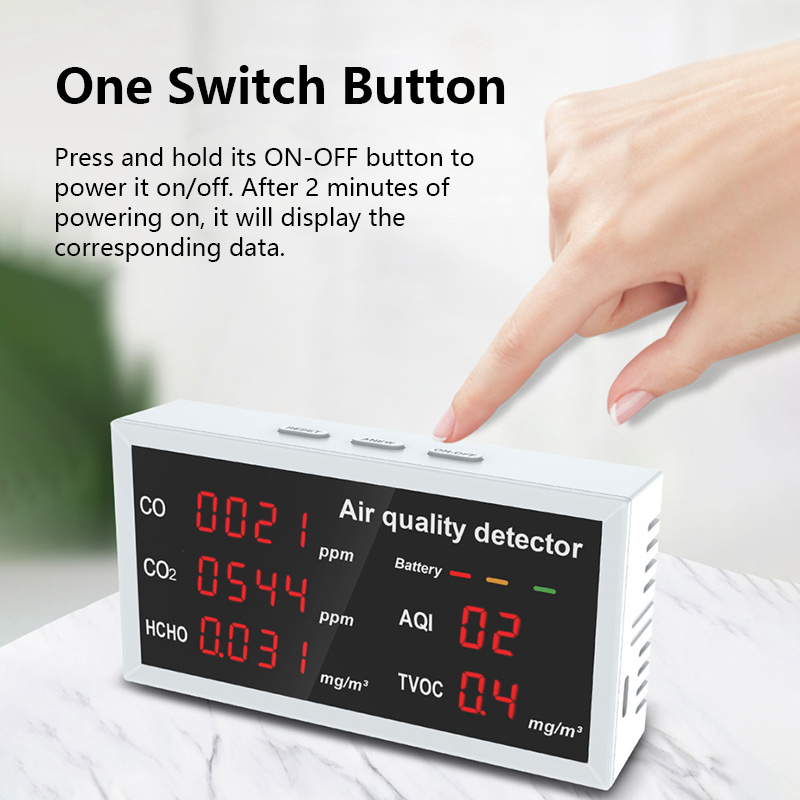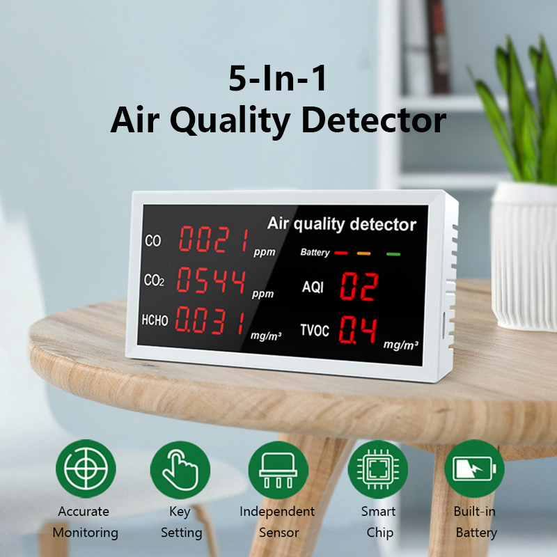 - 5-in-1 air quality meter: It can be used to CO, CO2, HCHO, AQI and TVOC
