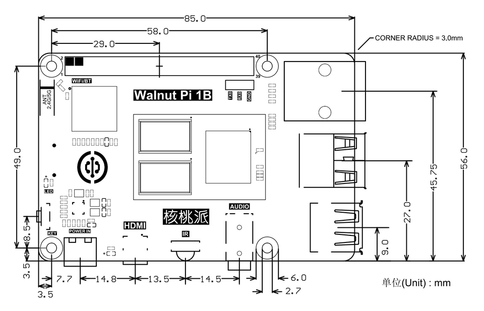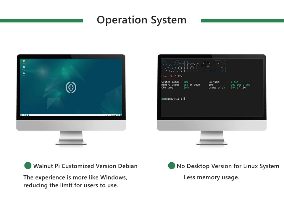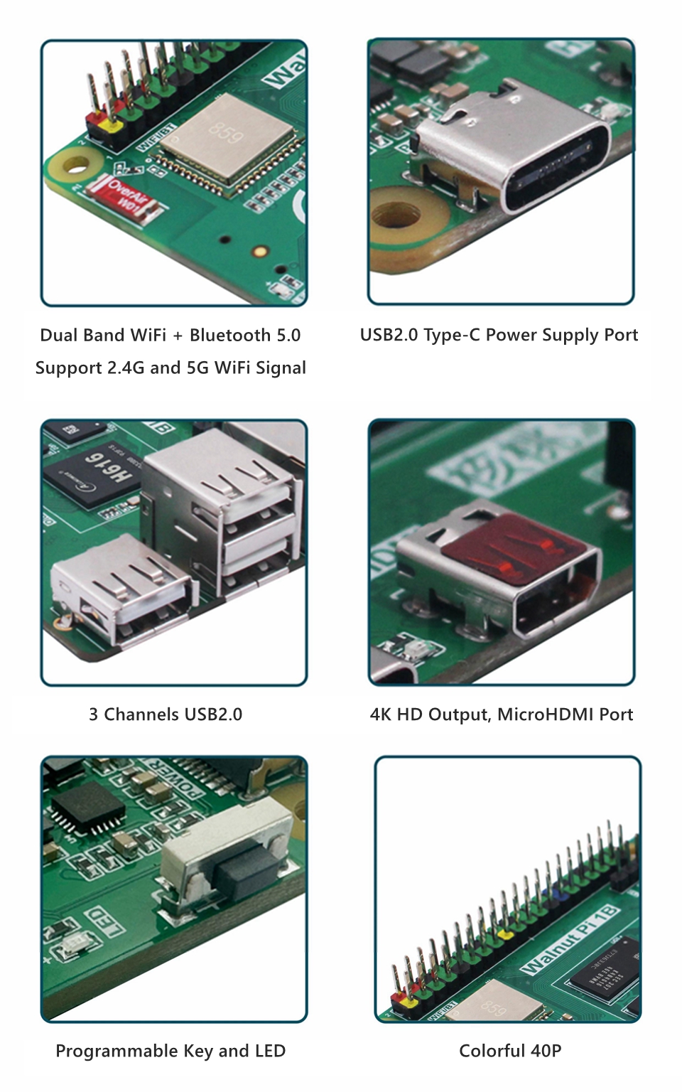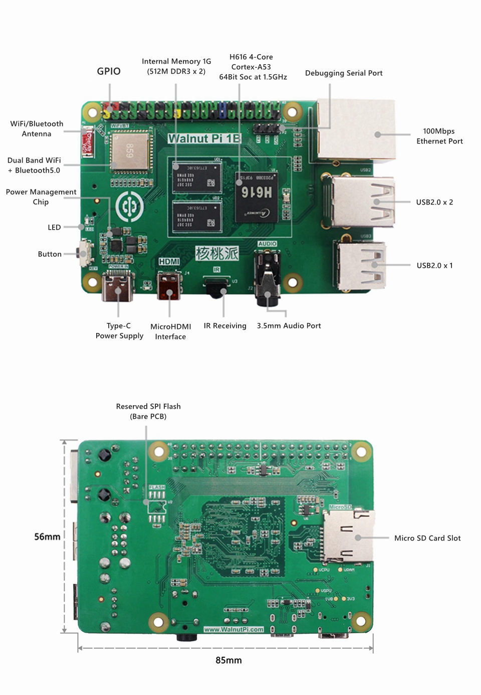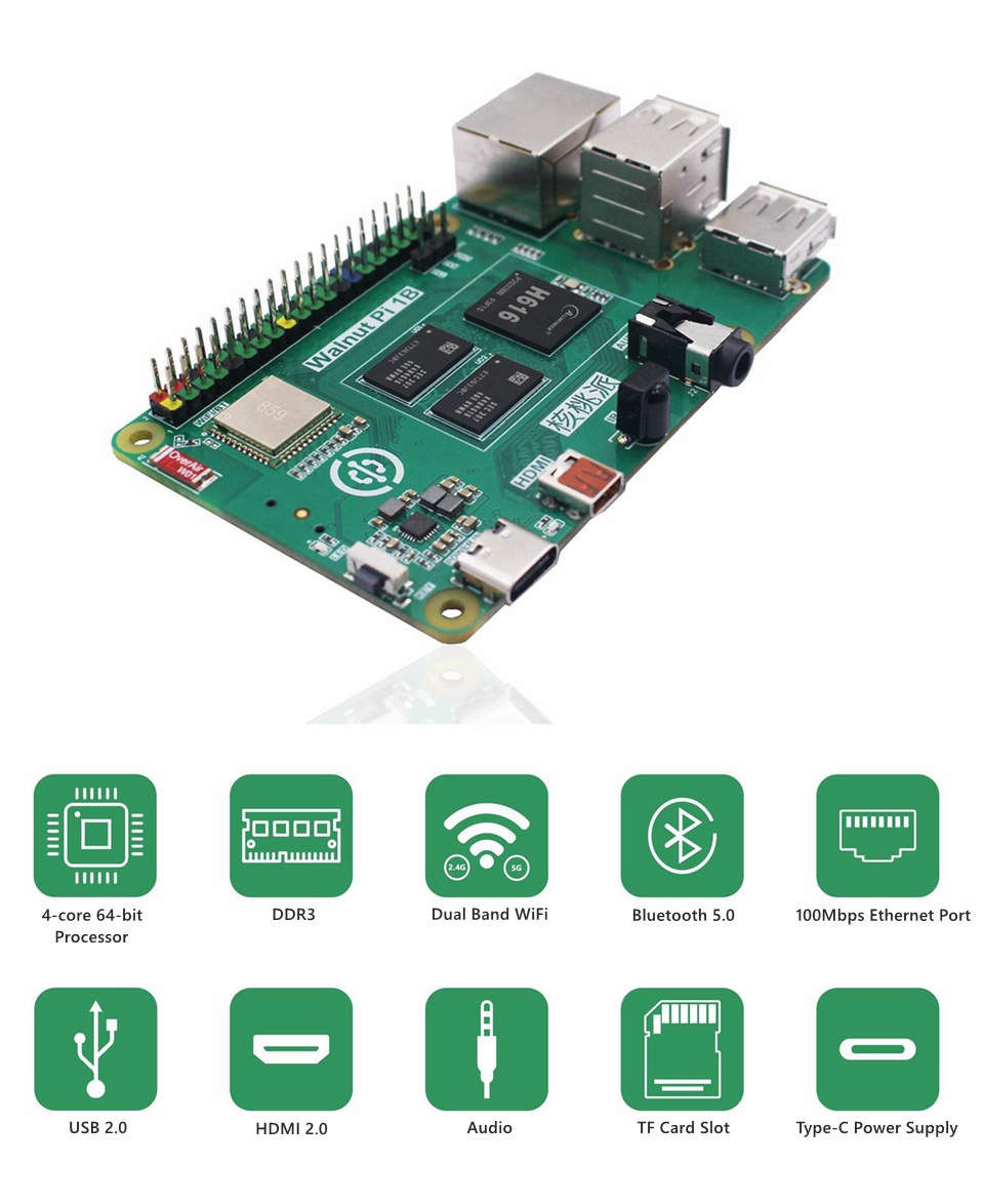 - Operation system: Walnut Pi customized version Debian (for Ubuntu, for Android adaptation in progress)