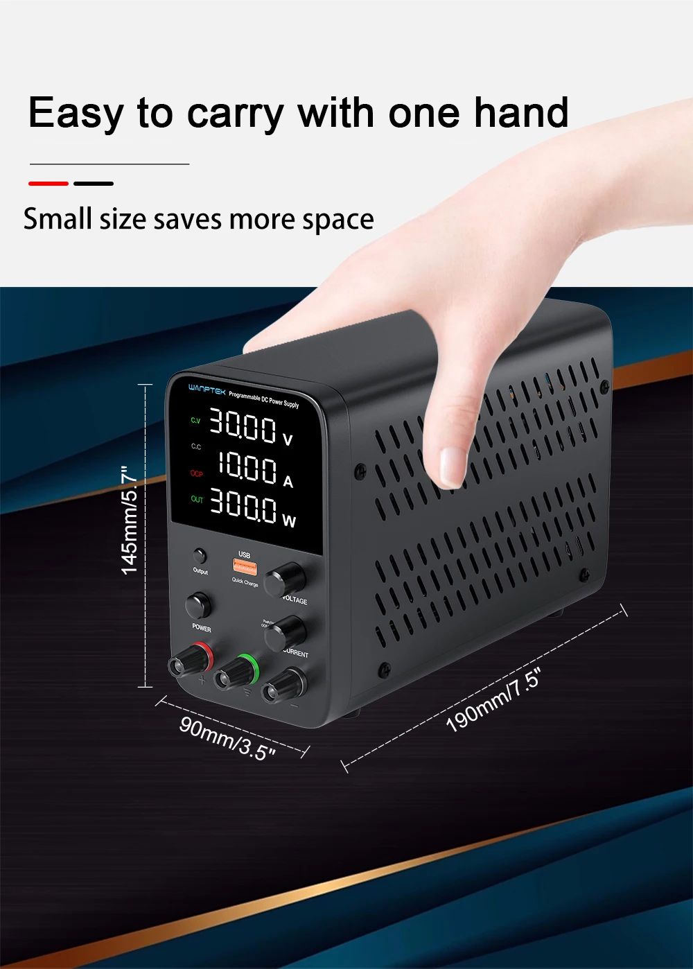 WPS3010H is a high-precision programmable DC power supply with three windows and four digits display, which can simultaneously display voltage, current and power. It is widely used in mobile phone repair, computer repair, battery charging, school teaching and production line use. Encoders allows for continuous adjustment of output voltage and current between 0 and nominal values, and preset values can be displayed for easy use and adjustment. This device has USB fast charging function and supports multiple fast charging protocols. With perfect OVP and OCP short-circuit protection circuits, this product also provides upper computer communication function (optional), making it convenient for users to connect the power supply to PC using USB connection cables. It can also achieve USB to RS232/RS485 interface through different conversion cables, which can control the use of power through software interface and achieve remote operation. The stability and ripple coefficient of the power supply are very good. It has a small size, beautiful design, convenient operation, and can work for a long time at full load, which is deeply loved by users.
