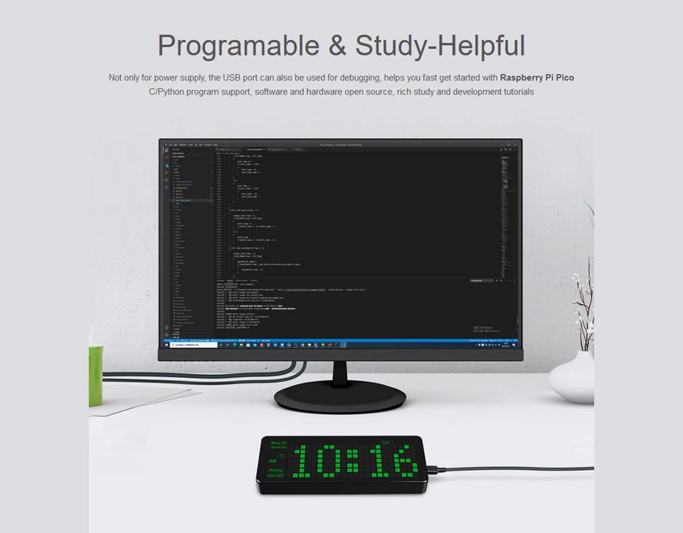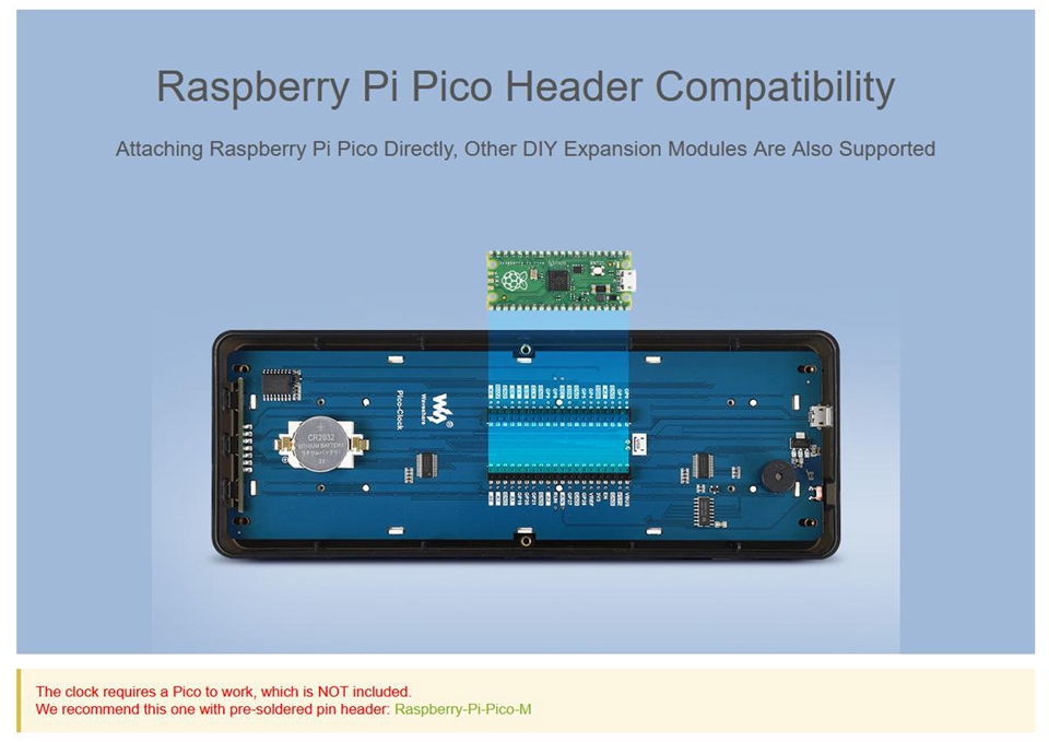 - The Pico-Clock-Green is an LED digits electronic clock designed for Raspberry Pi Pico. It incorporates high precision RTC chip DS3231, photo-sensor, buzzer, and buttons, features multiple functions including accurate electronic clock, temperature display, auto brightness adjustment, alarm, and button set. The important part is, rich open source codes and development tutorials are also provided to help you fast get started with Raspberry Pi Pico and make your own original electronic clock.