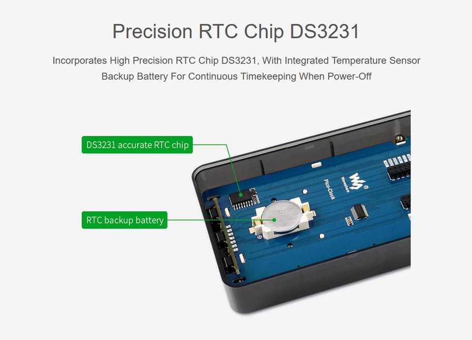 - Onboard high precision RTC chip DS3231, with backup battery holder, maintains accurate timekeeping when main power is off: