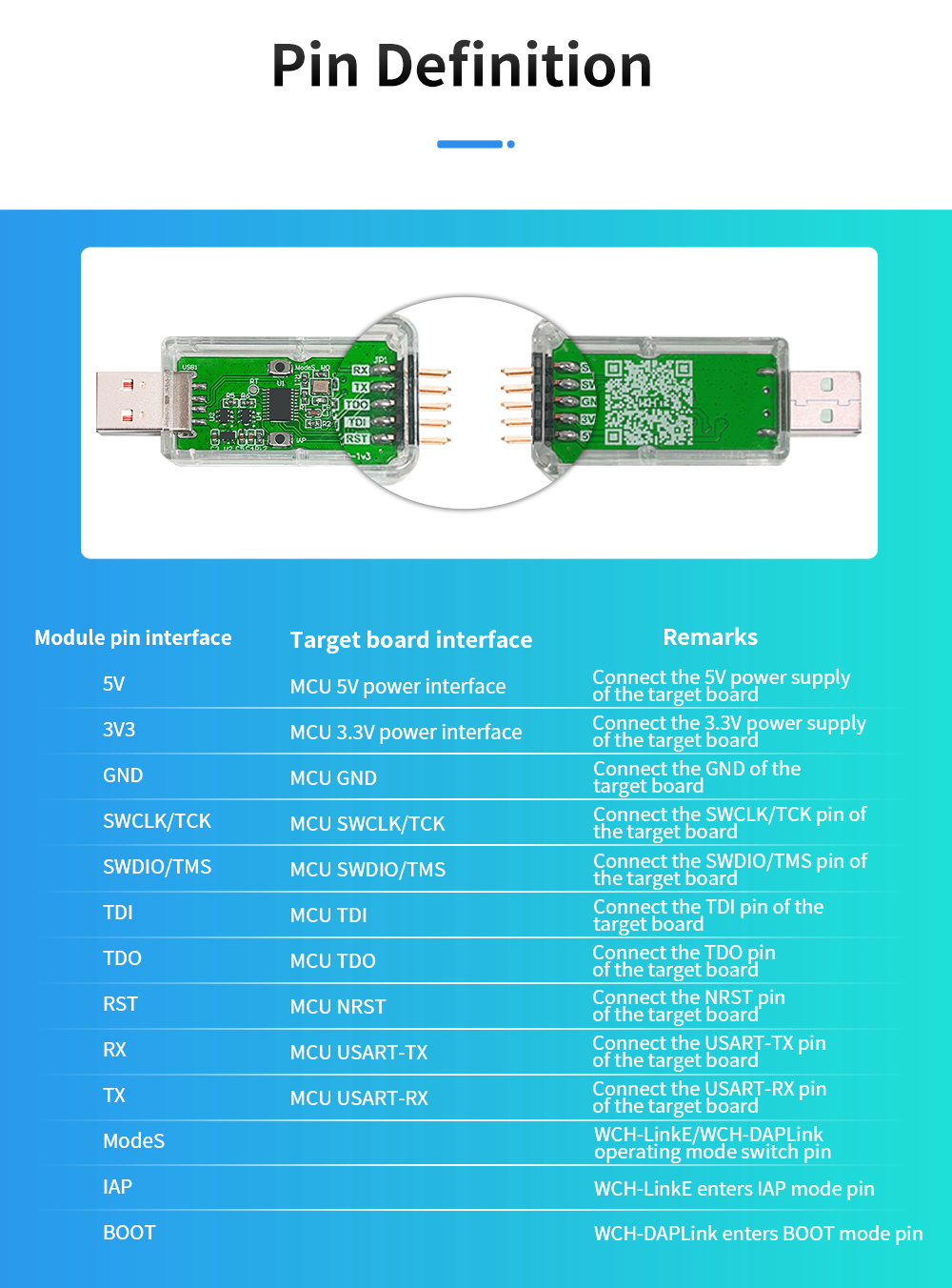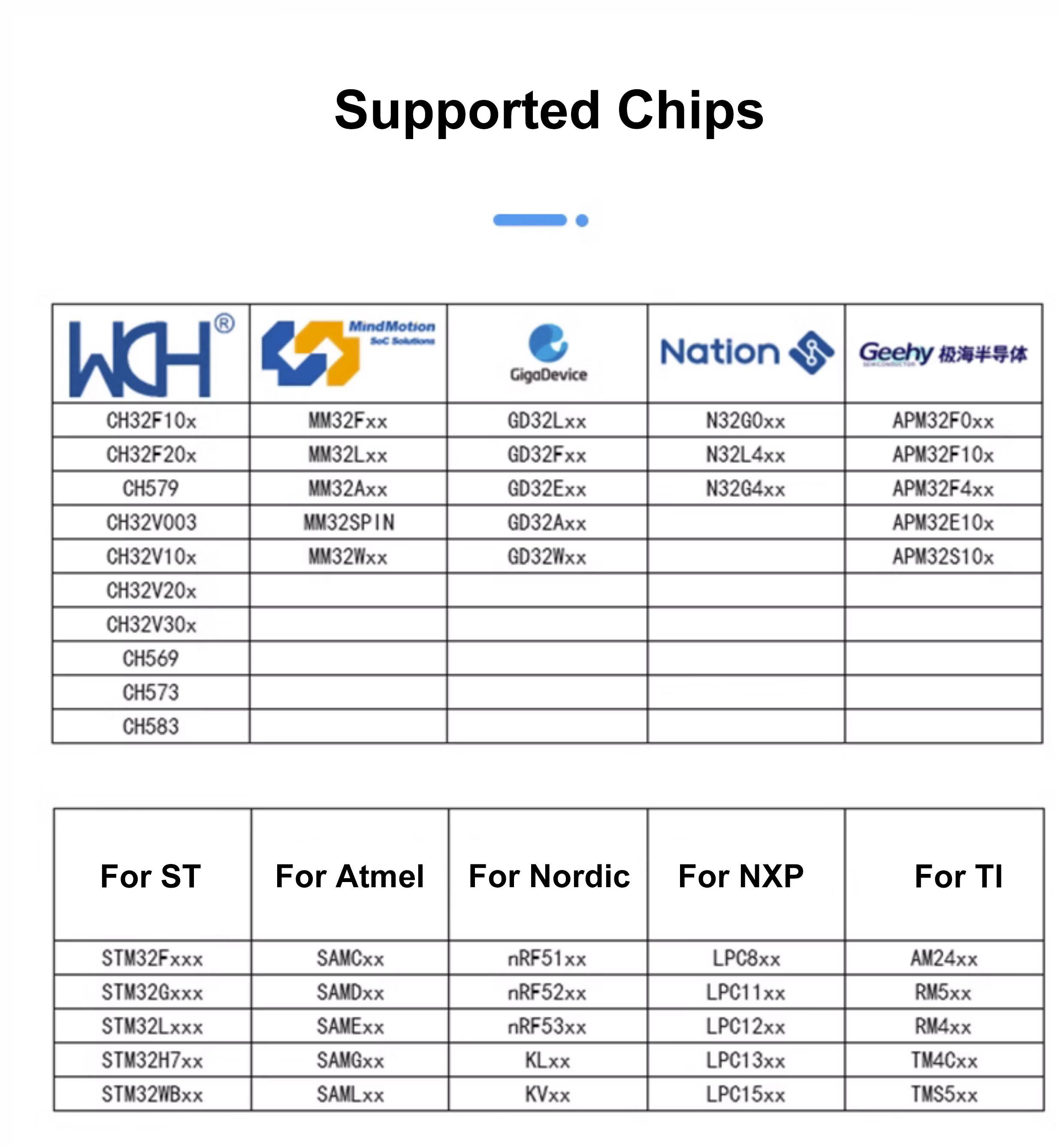 - Supports WCH RISC-V architecture MCU and CORTEX-M core with SWD/JTAG interface