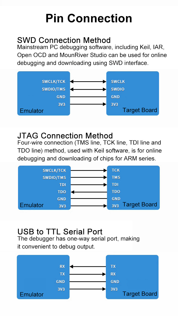 - Supports downloading and debugging for ARM kernel MCU with SWD/JTAG interface