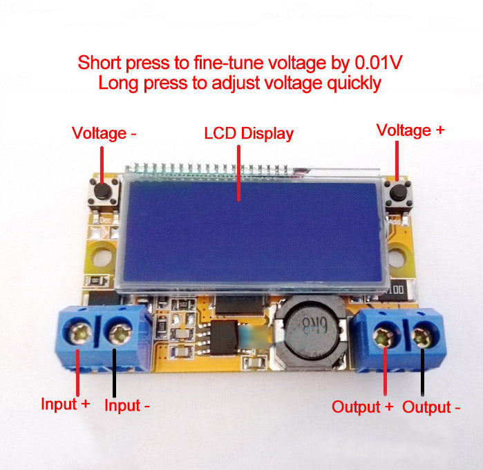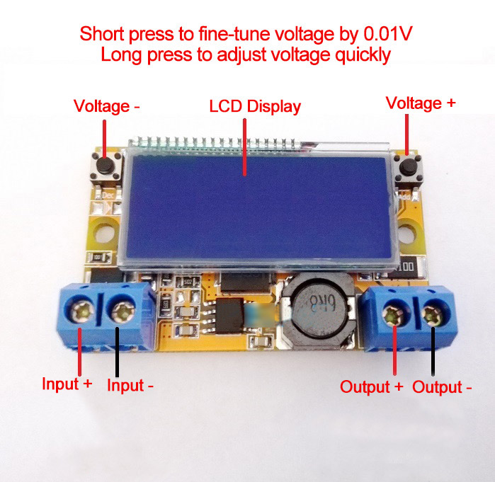 - Output voltage: 0.01V-18V continuously adjustable. Automatically save the last set voltage (The input voltage must be 1V higher than the output voltage).