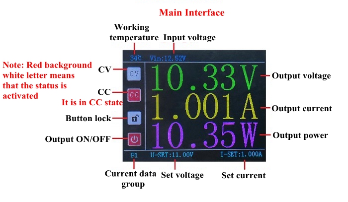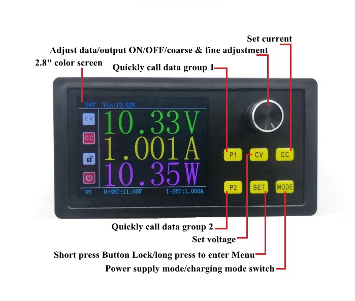 In the main interface, directly short press code switch to open or close output terminal voltage. When closed, voltage, current, and power all display 0.