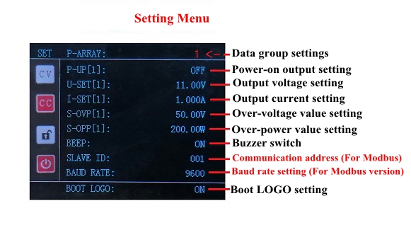 Short press CV key, U-SET font below will be displayed in red, rotary coding switch can adjust the current output voltage value, and short press the coding switch can switch between coarse and fine adjustment. After adjustment, long press CV key to save and exit. (You can also enter SET menu to set the current voltage)