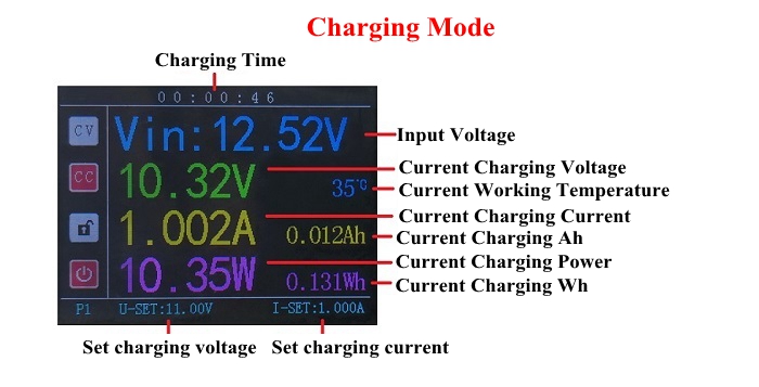 The output must be turned off (short press code switch to switch output), press MODE button to enter charging mode. The positive output of the output must be connected to B+ terminal, which has a backflow prevention function and automatically turns off the output after fully charged to protect your battery from overcharging. Press MODE again to switch back to mode. (Note: One minute after starting charging, when the detected charging current is less than 5% of the set current, it is considered that the battery is fully charged and it will automatically disconnect).