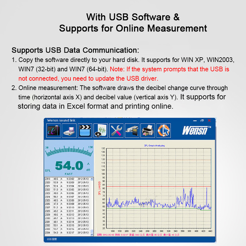 WENSN WS1361C 30-130dB Digital Sound Level Meter Decibel Meter (USB Communication + 512MB SD Card)