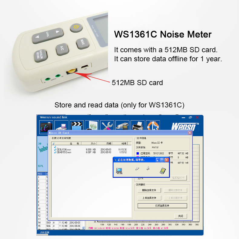 - WS1361C noise meter comes with a 512MB SD card. It can store data offline for 1 year