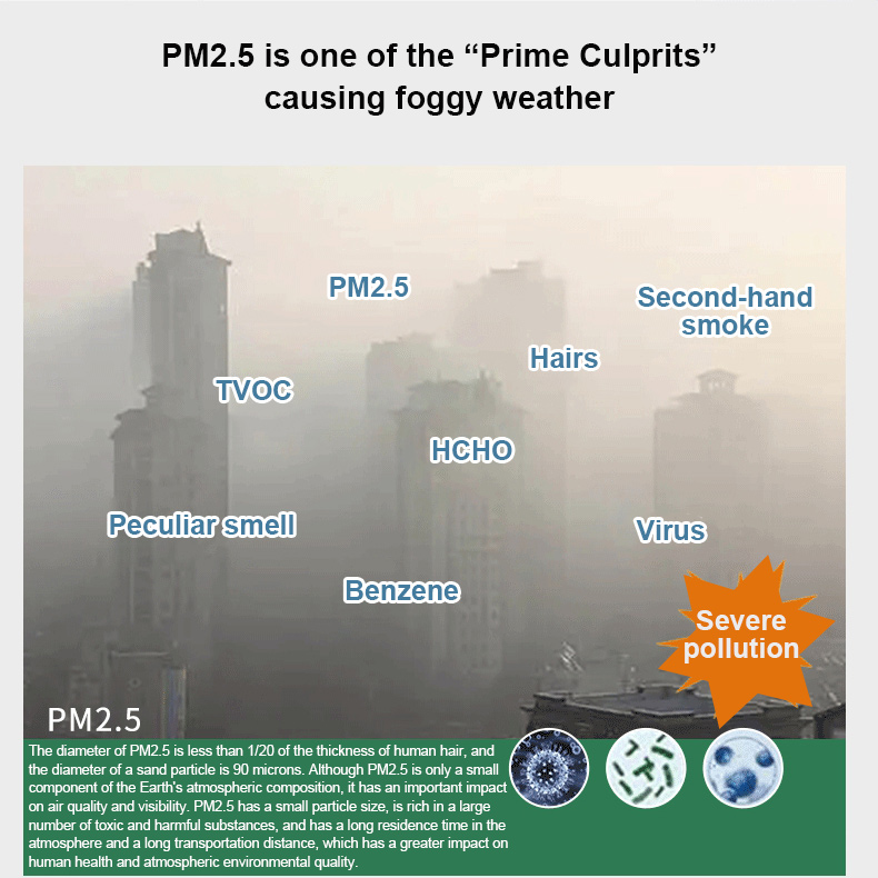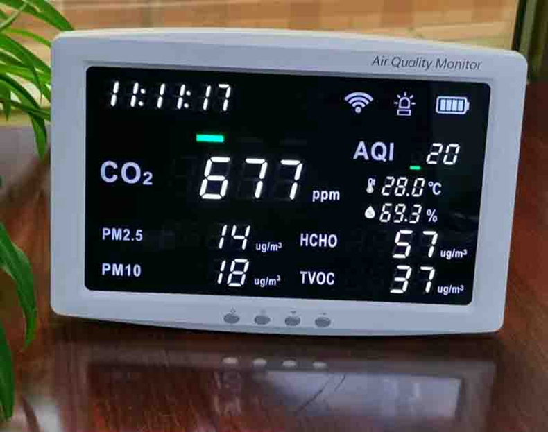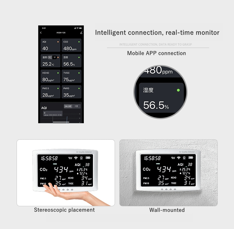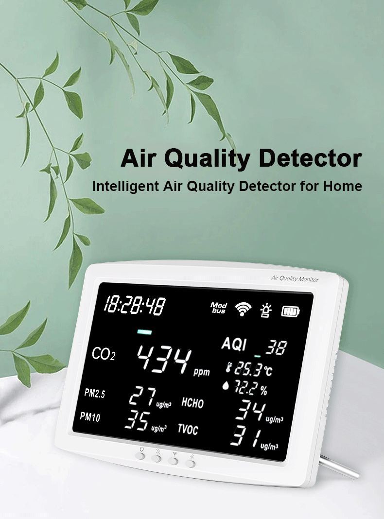 - This product uses NDIR (Non-dispersive Infrared Ray) gas sensors to accurately detect the concentration of carbon dioxide in the surrounding air, as well as PM2.5, PM10, formaldehyde, TVOC, temperature, and humidity in the air, and calculate the environmental AQI index based on the detection data.