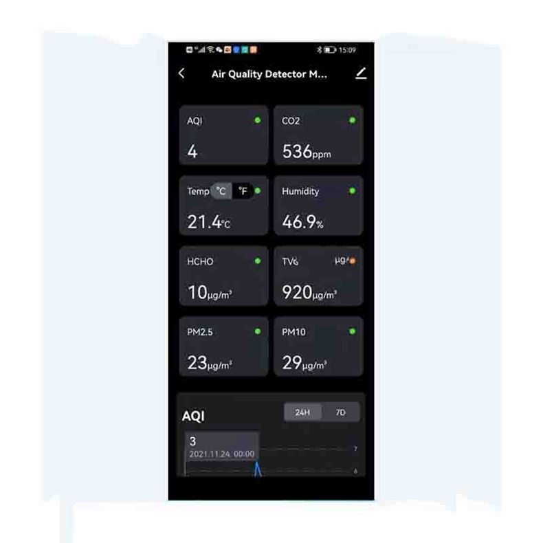 - Configured with Tuya app, you can view real-time detection data through mobile app anytime and anywhere, and check 7-day historical detection records and data change charts; You can also achieve joint linkage with other electronic products (fresh air systems, air purifiers, humidifiers, air conditioners, etc.) through Tuya in a WiFi environment, and control the operation and use of other electronic products through test data.