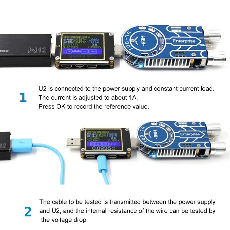 17. U2 is connected to the power supply and constant current load. The current is adjusted to about 1A. Press OK to record the reference value.The cable to be tested is transmitted between the power supply and U2, and the internal resistance of the wire can be tested by the voltage drop.