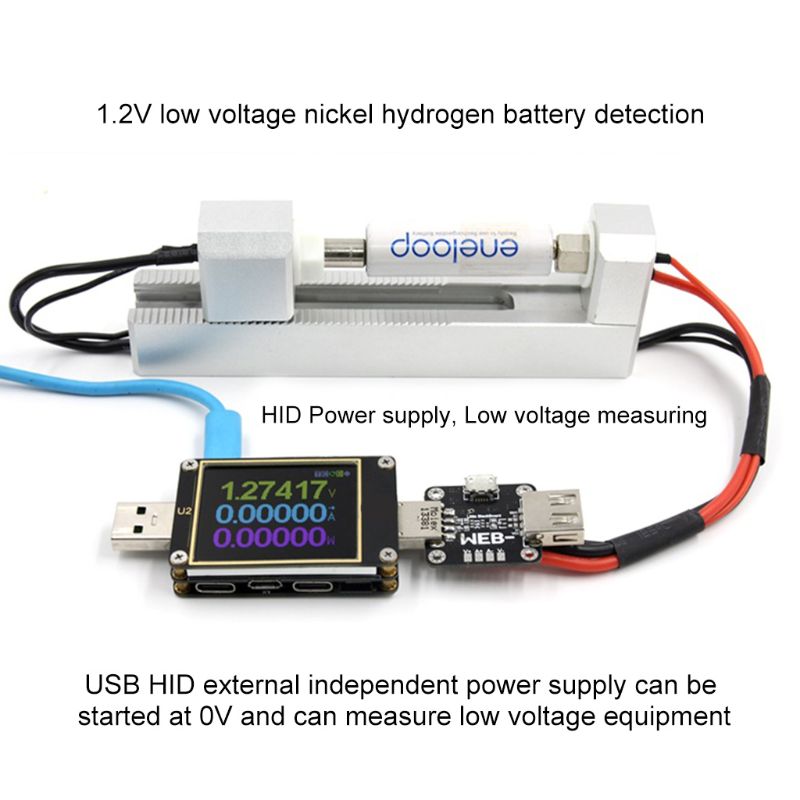 16. 1.2V low voltage nickel hydrogen battery detection (battery is not included), HID Power supply, Low voltage measuring , USB HID external independent power supply can be started at 0V and can measure low voltage equipment.