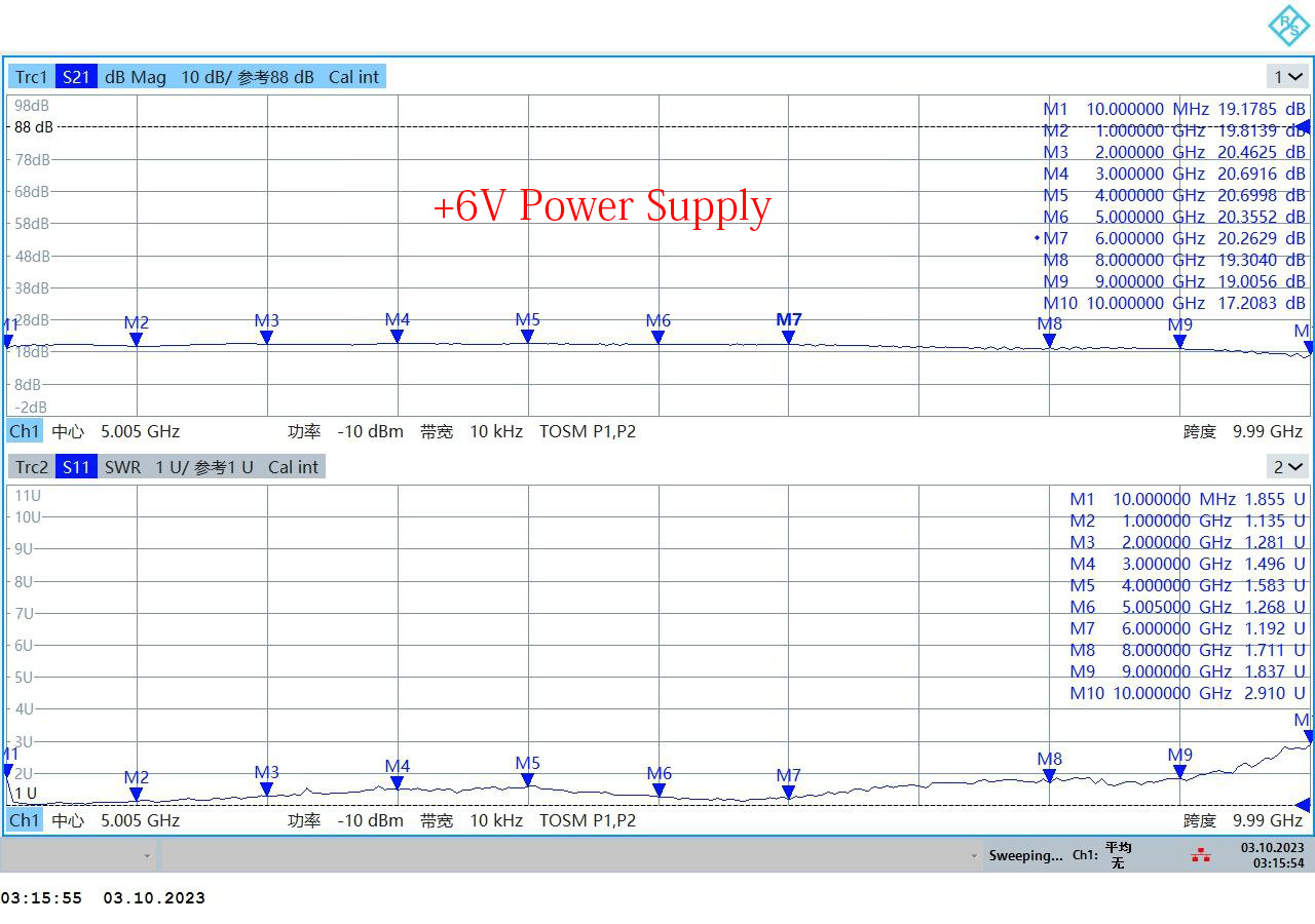 - It is an ultra-wide band low phase noise amplifier with full frequency band of 10M-10000M, noise coefficient ≤ 1.5, GdB gain>20dB and very good flatness less than 2dB.