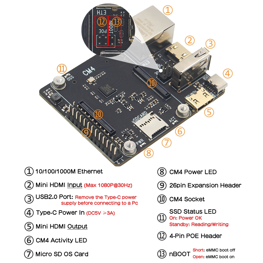 - USB2.0 Type-A connector for external USB hub and programming the CM4 eMMC