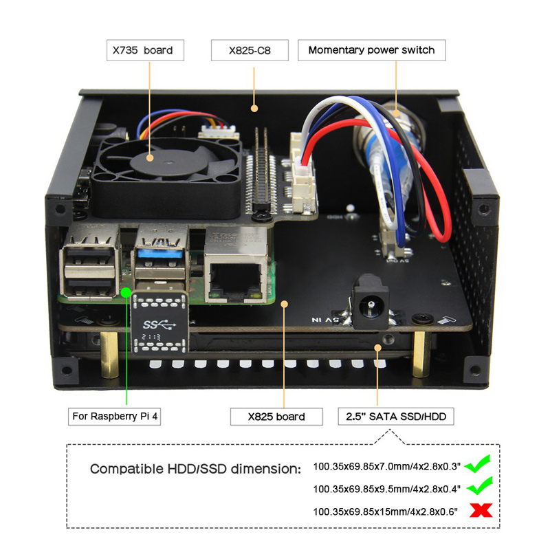 - Supports up to 4TB 2.5-inch SATA hard disk drives (HDD) / solid-state drive (SSD) (Theoretically it can work with 6TB or 8TB as well. But actually we do not test the X825 board with 6tb or 8tb HDD, you can have a try.)