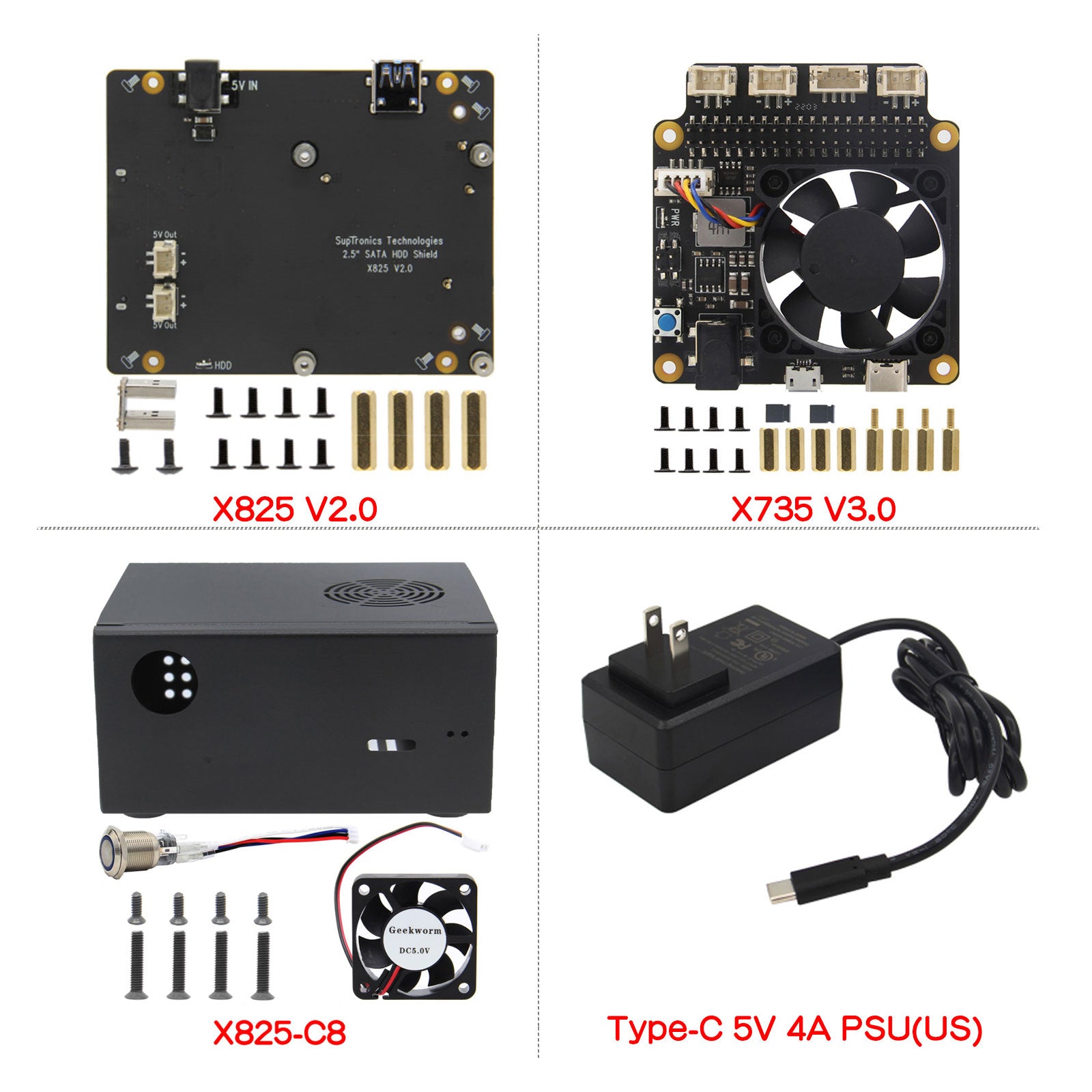 X825 V2.0 2.5 Inch SATA HDD/SSD Expansion Board + X825-C8 Case + X735 V3.0 + 5V 4A Power Adapter