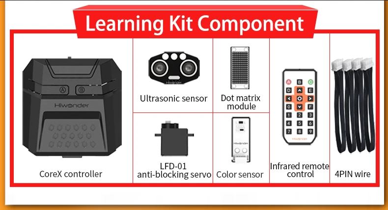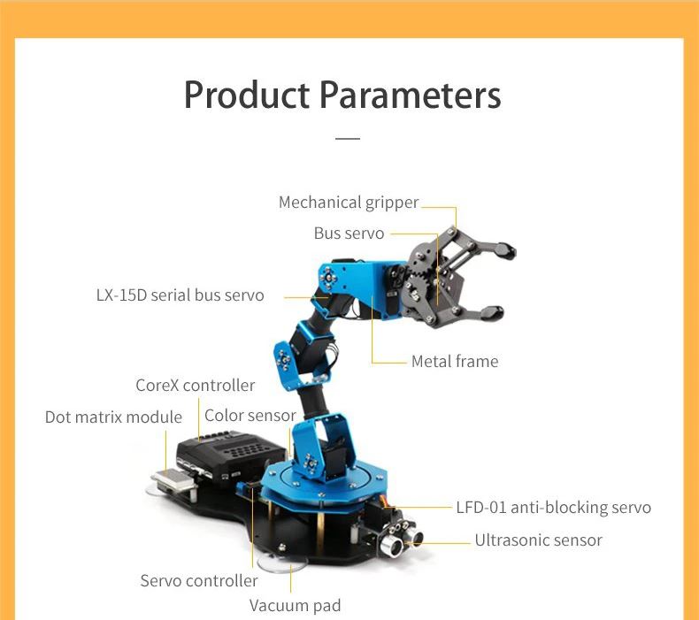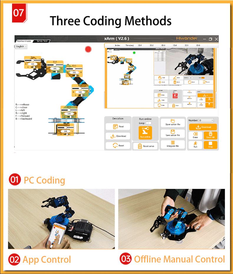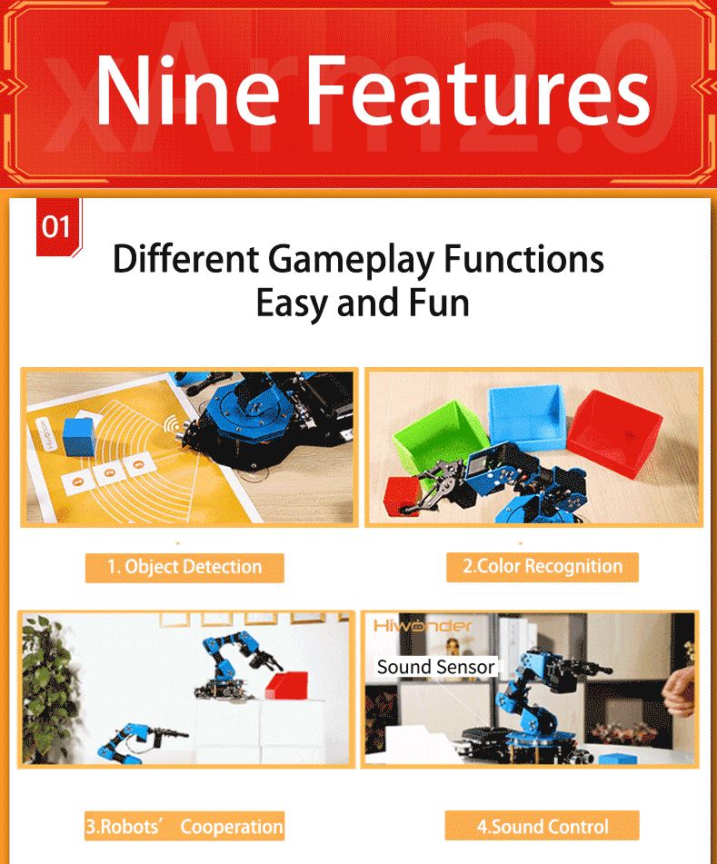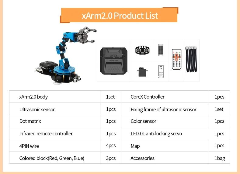 - Brand-new Sensor: xArm2.0 has matched with dot matrix module, ultrasonic sensor, color sensor, anti-blocking servo and infrared remote controller. All these sensors are in same design, using unified 4PIN connectors.