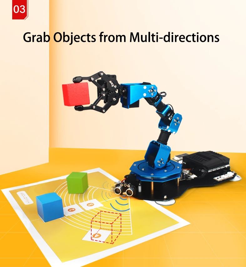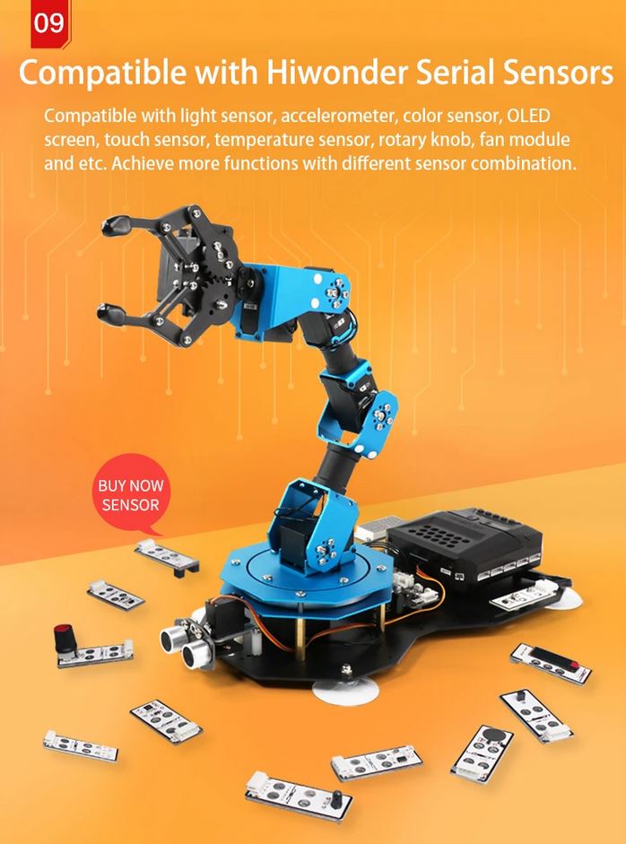 xArm2.0 learning kit supports for Scratch and Python coding, matched with more than 10 electronic modules. You could easily achieve many creative functions. Compatible with all series Hiwonder sensor, you could extend more functions with xArm2.0.